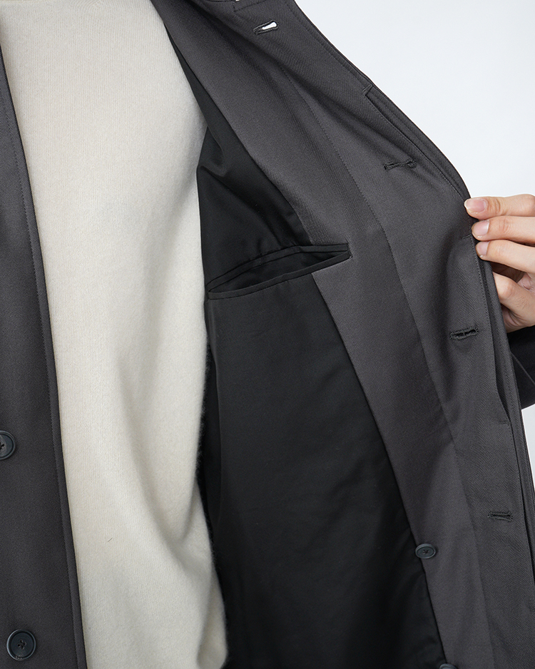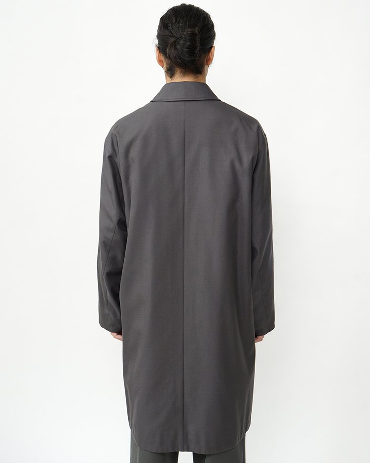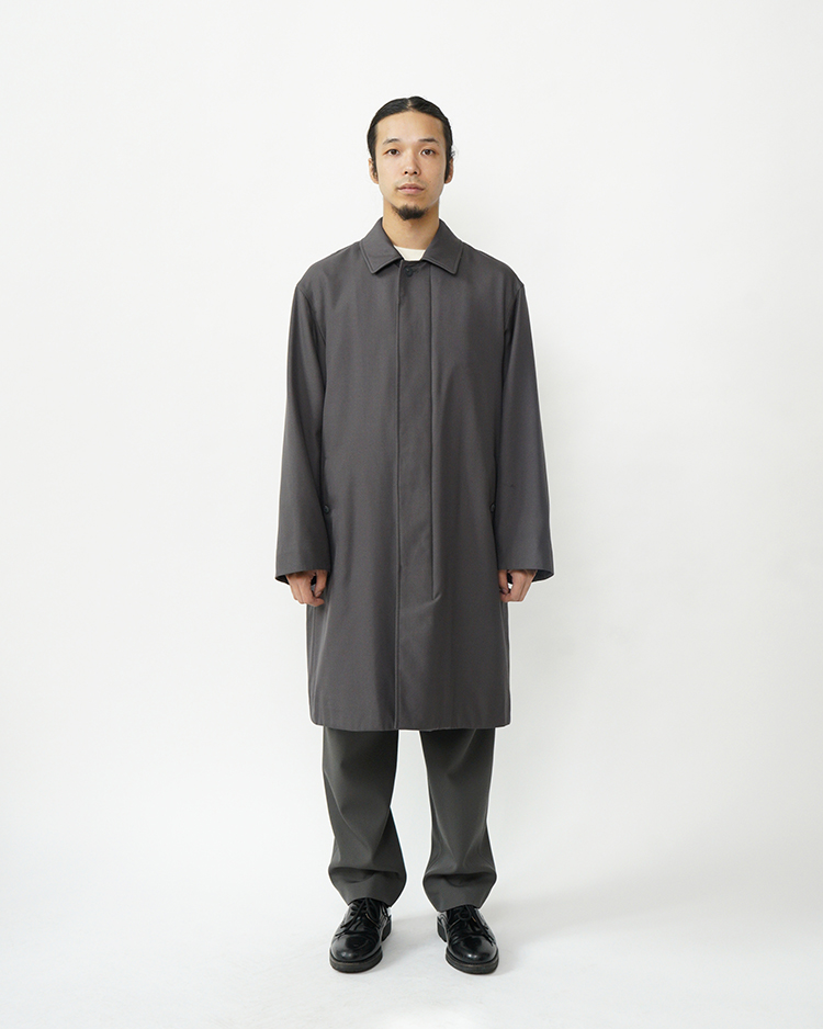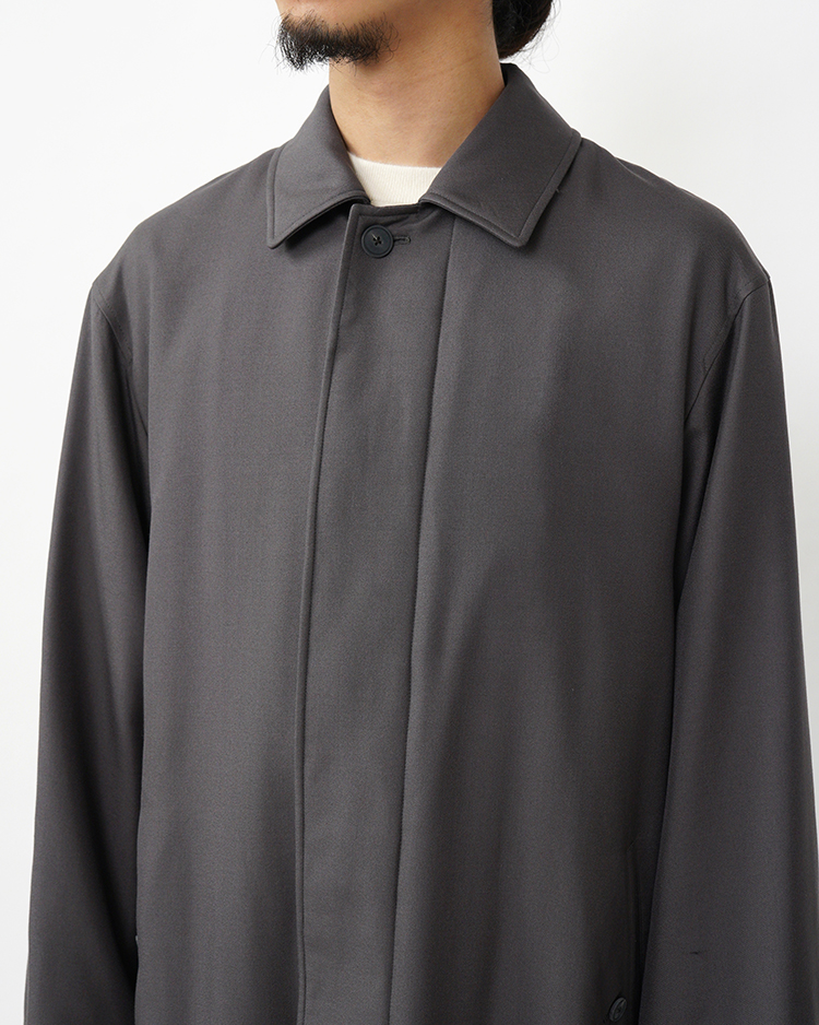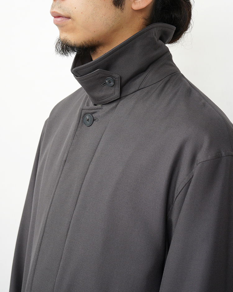 ややゆったりしたAラインシルエットで、リラックスした雰囲気が特徴のステンカラーコート。裏地にはコットンの起毛がかった柔らかい生地を採用することで、肌当たりの良い着心地と、立体的なシルエットを作り出します。また、特殊加工を施したシルクポリエステルの中綿を使用しています。
