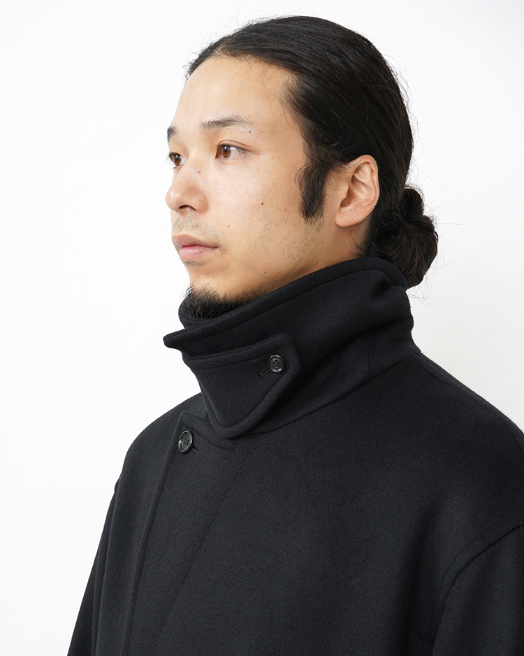 SUPER140’s原料を混紡したダブルメルトンのショールカラーコート。原料由来の上質な風合いに加え、中糸に水溶性糸を取り入れることで軽さとふくらみを実現。暖かな空気をしっかり閉じ込めます。ショートビーバー仕上げによるフラットな表情と自然な膨らみが、快適な着心地と上質な佇まいを生み出す一着です。