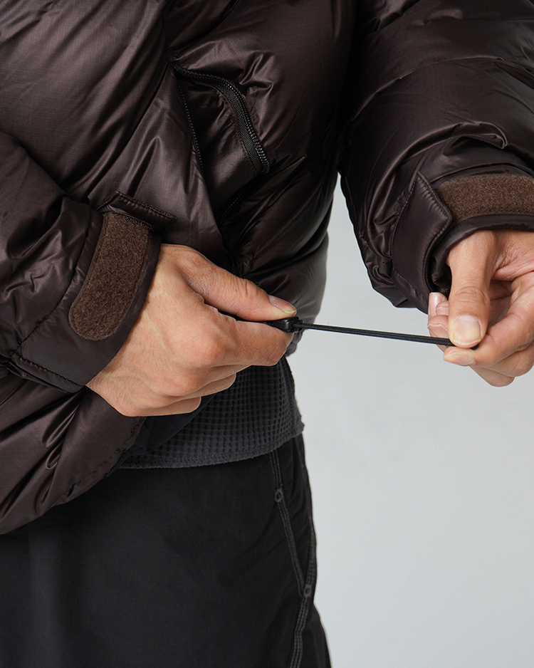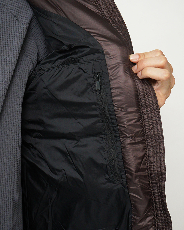 中に封入しているのは、かさ高性と軽量性を両立させた高品質な新毛のダックダウン。高度な洗浄技術によりダウン本来の機能を引き出しているCLEANDOWNです。ダウンのバッフル構造は、ダウンが背中の中心部分に集まる形状になっているため、体幹を効率的に保温。首まわりにもダウンチューブを配し、コールドスポットを少なくしています。