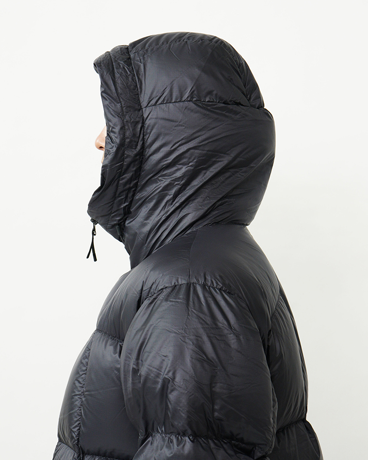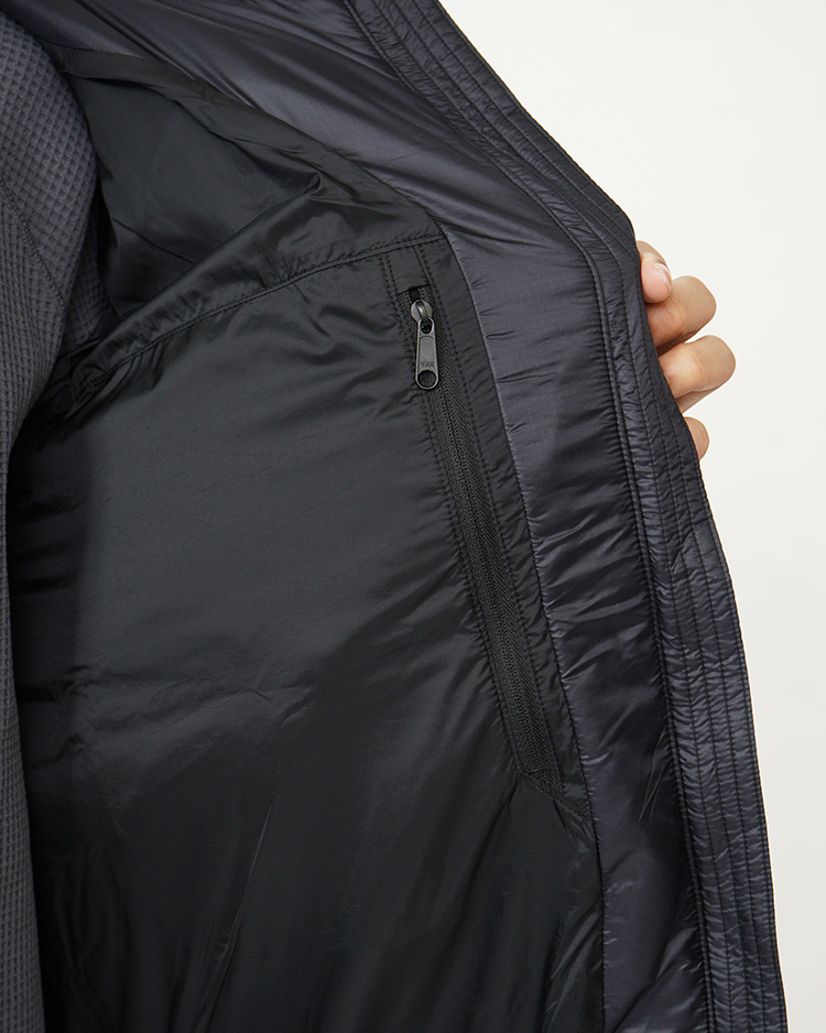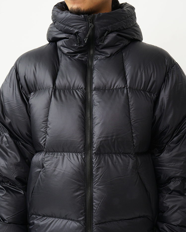 中に封入しているのは、かさ高性と軽量性を両立させた高品質な新毛のダックダウン。高度な洗浄技術によりダウン本来の機能を引き出しているCLEANDOWNです。ダウンのバッフル構造は、ダウンが背中の中心部分に集まる形状になっているため、体幹を効率的に保温。首まわりにもダウンチューブを配し、コールドスポットを少なくしています。