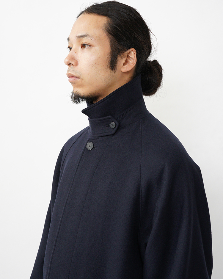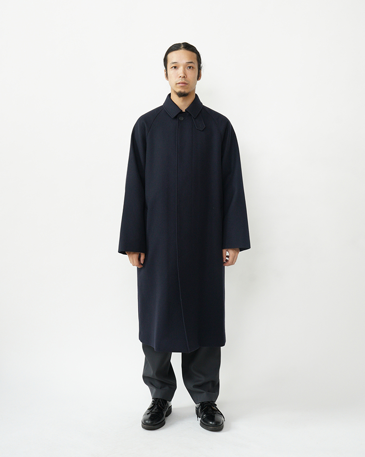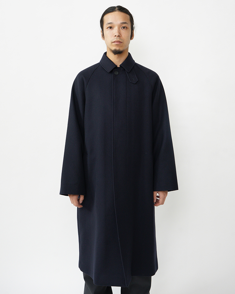 ベーシックなストレートシルエットのバルマカーンコート。90年代のフランス軍のコートをベースに、大胆に広くとった身幅と、裾に向かって広がる迫力あるAラインシルエットが特徴です。裏地に使用している特殊な洗いのかかった柔らかいコットン素材が、立体的なシルエットを作り出します。