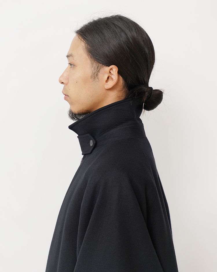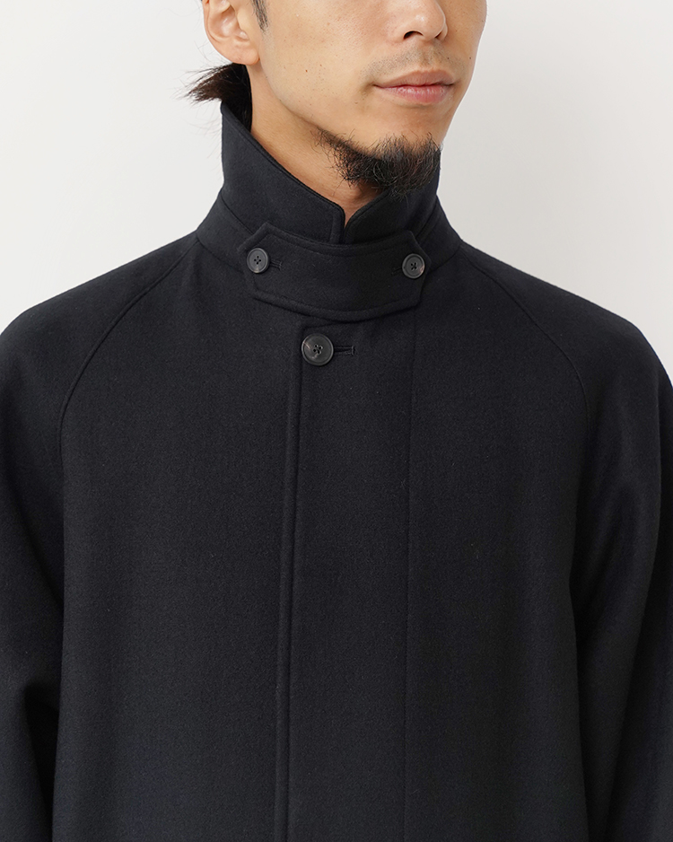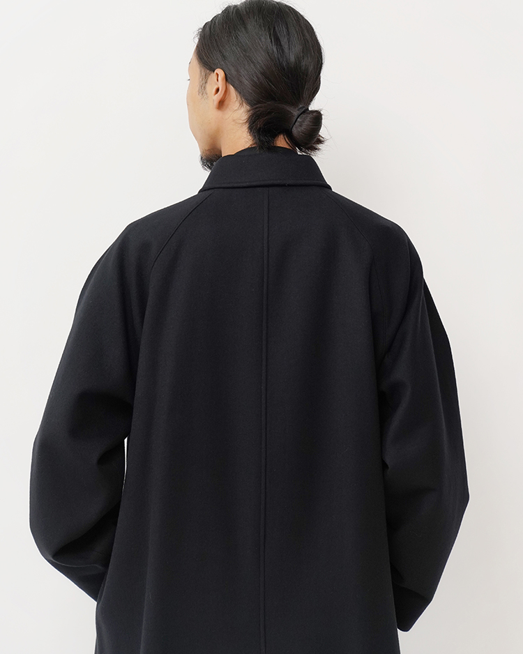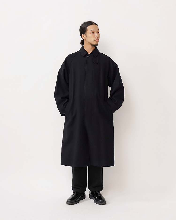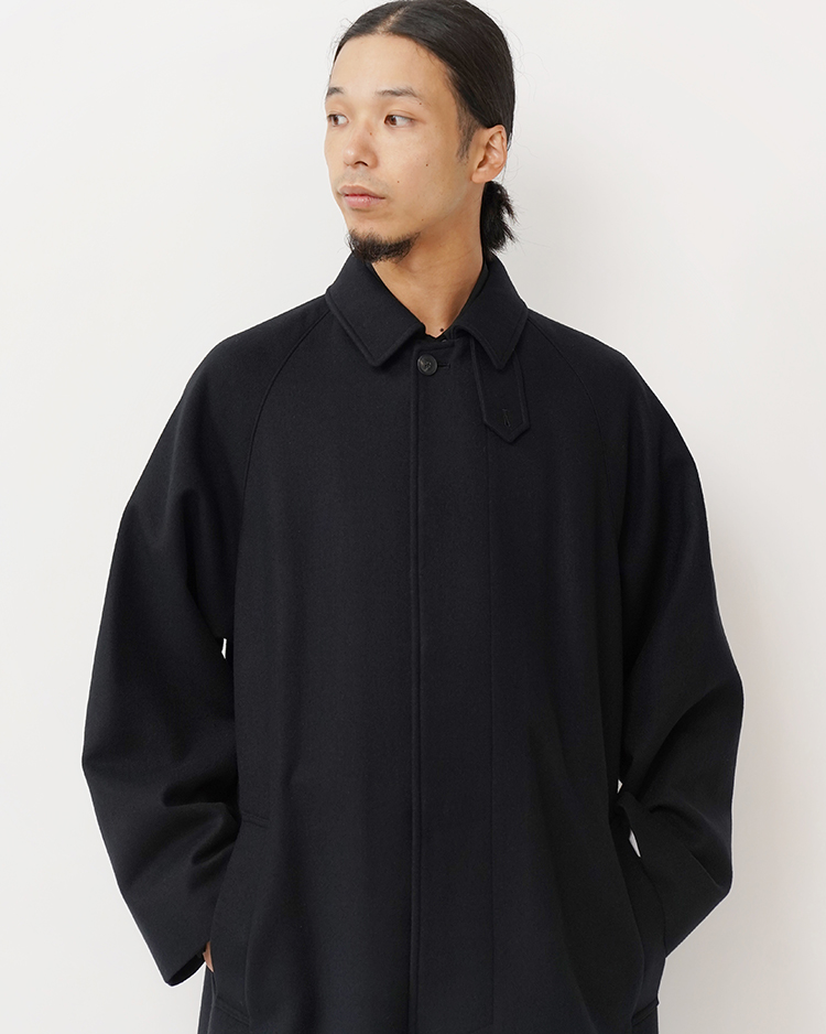 ベーシックなストレートシルエットのバルマカーンコート。90年代のフランス軍のコートをベースに、大胆に広くとった身幅と、裾に向かって広がる迫力あるAラインシルエットが特徴です。裏地に使用している特殊な洗いのかかった柔らかいコットン素材が、立体的なシルエットを作り出します。