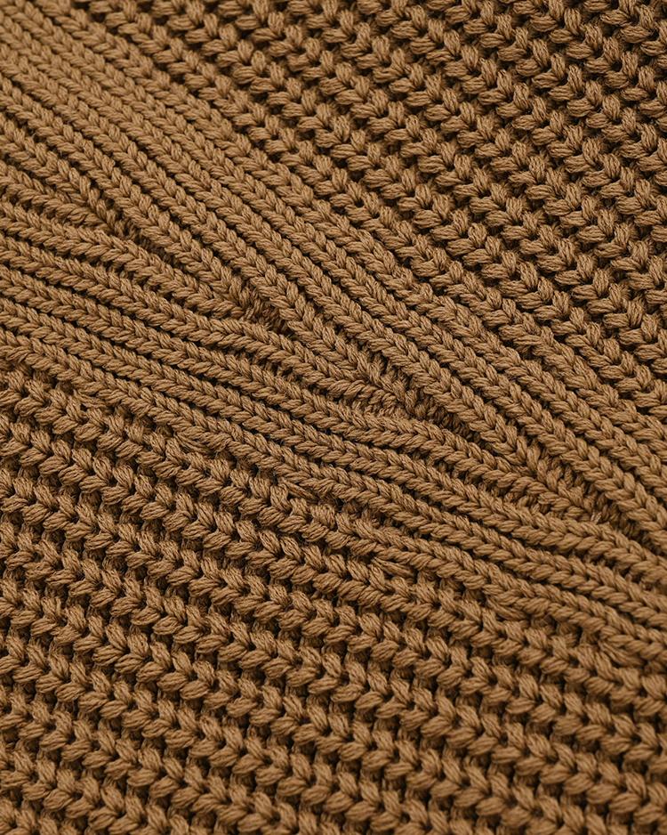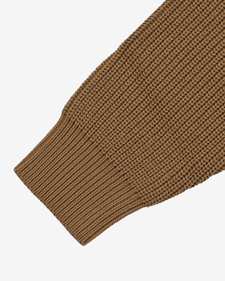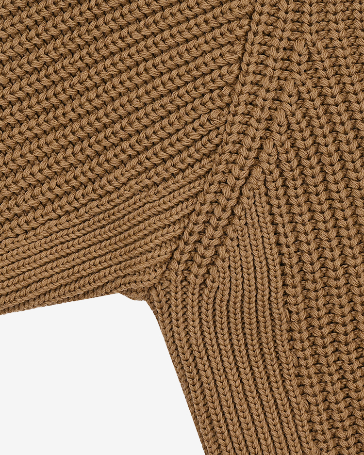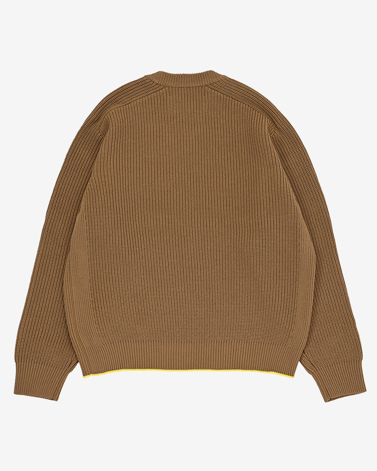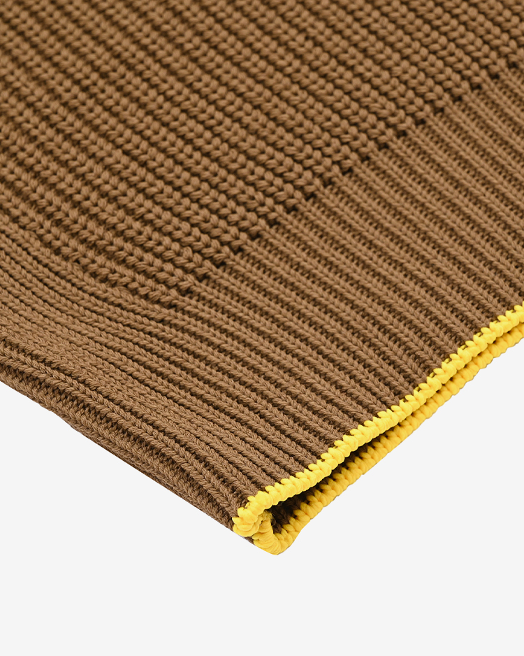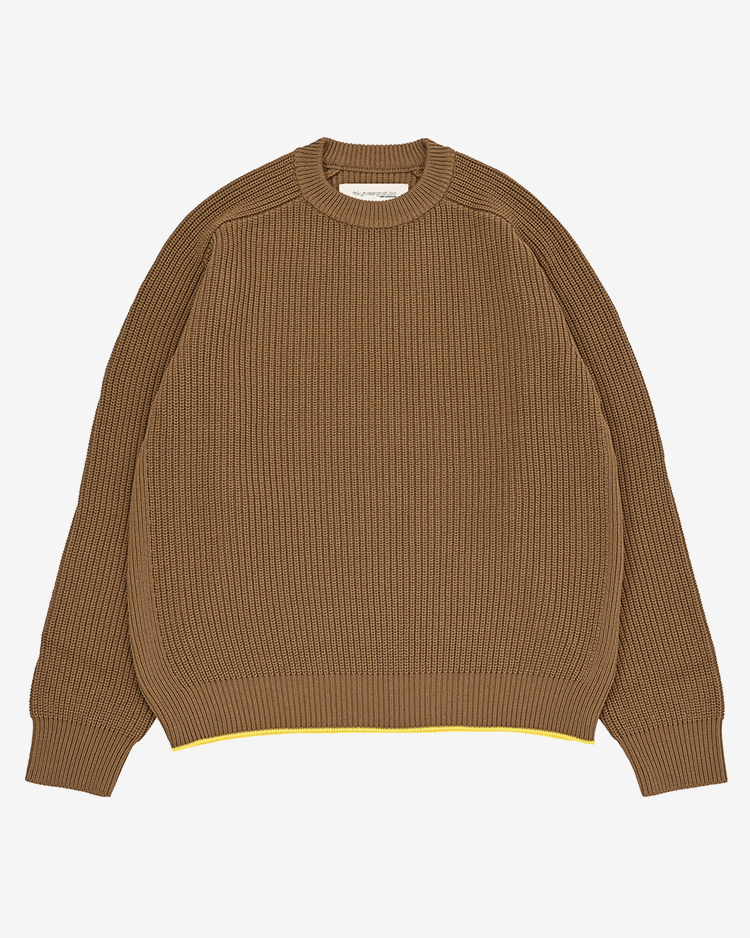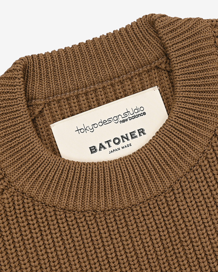 BATONER のシグネチャーである 7 ゲージ片畔編みで仕立てたニットウェア。素材には、細くなめらかな風合い の未防縮ウールに、回収したペットボトルから再生産したリサイクルの機能ポリエステルを複合した、軽さと強撚ウールのようなドライなタッチが特徴のコンフォートヤーンを使用し、現代的な機能性を追求しました。オーセン ティックなスウェットシャツのディティールにインスパイアされたラグランスリーブ仕様や、サイドパネルには 異なる組織で編み立てた生地を採用し、伝統的な片畔編みの伸縮性を最新のアスレチックマインドで再構築。快適 な着心地を実現しながら、モダンなスタイルが引き立ち、シルエットに洗練されたアクセントを加えました。また、 イエローの配色は、1990 年代にアメリカで実施された Procare Program(プロケア・プログラム / 医療専門 機関と選ばれたフットウェア専門ディーラーの認定マーク)の色からインスパイアされ、ニューバランス・フット ウェアのものづくりで最優先事項の “フィット” と “クオリティ” を、アパレルのものづくりでも引き継いで表現し ています。