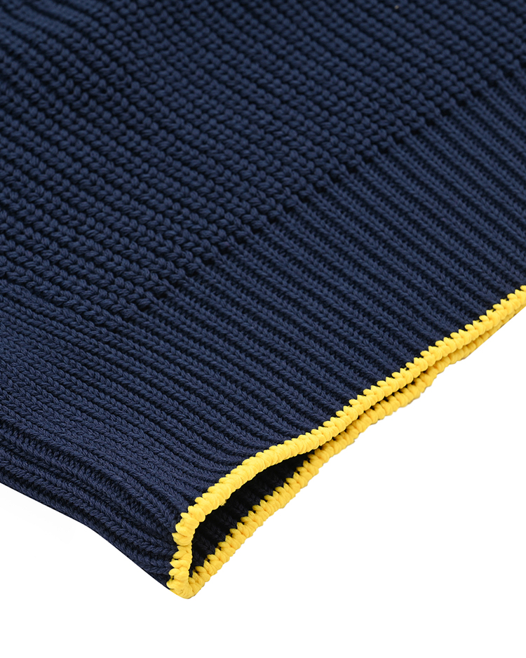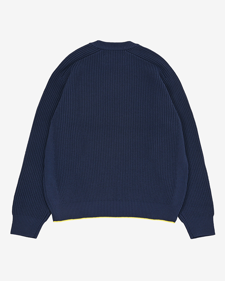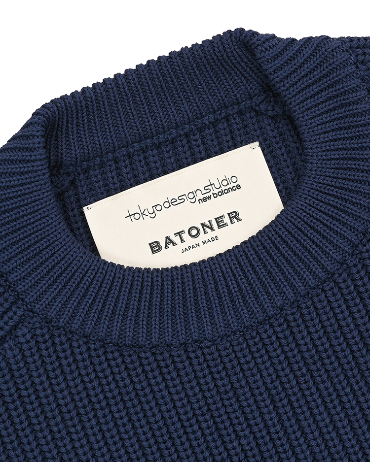 BATONER のシグネチャーである 7 ゲージ片畔編みで仕立てたニットウェア。素材には、細くなめらかな風合い の未防縮ウールに、回収したペットボトルから再生産したリサイクルの機能ポリエステルを複合した、軽さと強撚ウールのようなドライなタッチが特徴のコンフォートヤーンを使用し、現代的な機能性を追求しました。オーセン ティックなスウェットシャツのディティールにインスパイアされたラグランスリーブ仕様や、サイドパネルには 異なる組織で編み立てた生地を採用し、伝統的な片畔編みの伸縮性を最新のアスレチックマインドで再構築。快適 な着心地を実現しながら、モダンなスタイルが引き立ち、シルエットに洗練されたアクセントを加えました。また、 イエローの配色は、1990 年代にアメリカで実施された Procare Program(プロケア・プログラム / 医療専門 機関と選ばれたフットウェア専門ディーラーの認定マーク)の色からインスパイアされ、ニューバランス・フット ウェアのものづくりで最優先事項の “フィット” と “クオリティ” を、アパレルのものづくりでも引き継いで表現し ています。