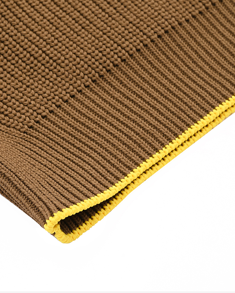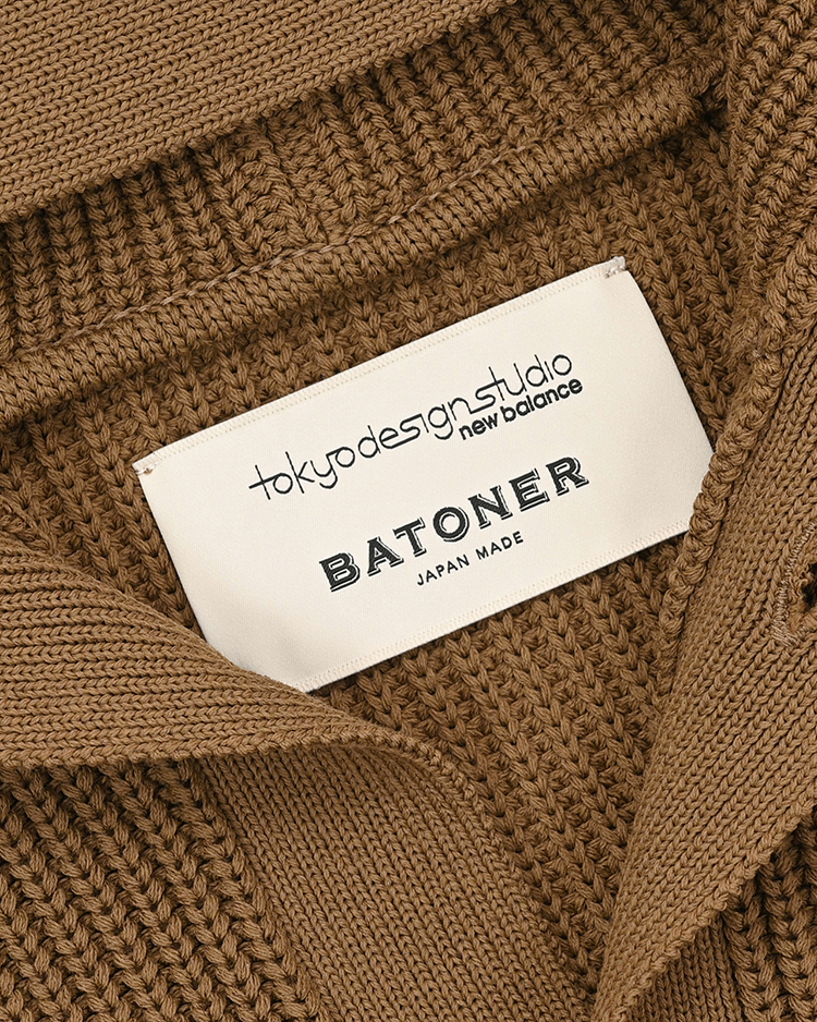 BATONER のシグネチャーである 7 ゲージ片畔編みで仕立てたニットウェア。素材には、細くなめらかな風合い の未防縮ウールに、回収したペットボトルから再生産したリサイクルの機能ポリエステルを複合した、軽さと強撚ウールのようなドライなタッチが特徴のコンフォートヤーンを使用し、現代的な機能性を追求しました。オーセン ティックなスウェットシャツのディティールにインスパイアされたラグランスリーブ仕様や、サイドパネルには 異なる組織で編み立てた生地を採用し、伝統的な片畔編みの伸縮性を最新のアスレチックマインドで再構築。快適 な着心地を実現しながら、モダンなスタイルが引き立ち、シルエットに洗練されたアクセントを加えました。また、 イエローの配色は、1990 年代にアメリカで実施された Procare Program(プロケア・プログラム / 医療専門 機関と選ばれたフットウェア専門ディーラーの認定マーク)の色からインスパイアされ、ニューバランス・フット ウェアのものづくりで最優先事項の “フィット” と “クオリティ” を、アパレルのものづくりでも引き継いで表現し ています。