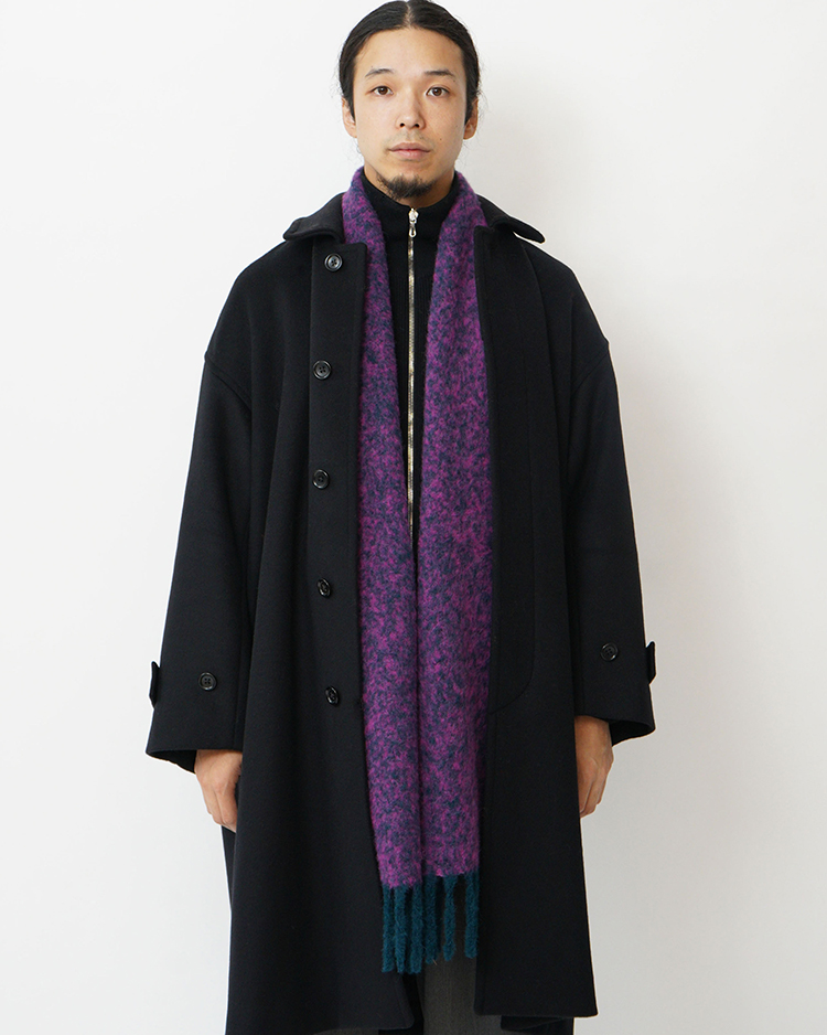 表面に糸の輪っかが出るように加工されたブークレ生地を使用しています。肌にあたる表面部分がアルパカ素材なので、柔らかさや暖かさに加えて、ブークレ生地ならではの肉厚さとその軽さが特徴です。
