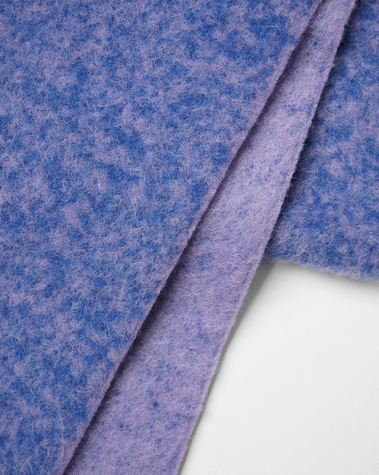 表面に糸の輪っかが出るように加工されたブークレ生地を使用しています。肌にあたる表面部分がアルパカ素材なので、柔らかさや暖かさに加えて、ブークレ生地ならではの肉厚さとその軽さが特徴です。