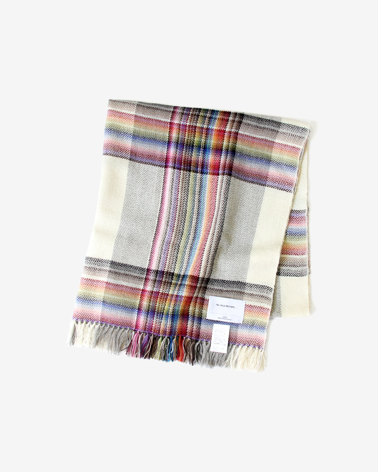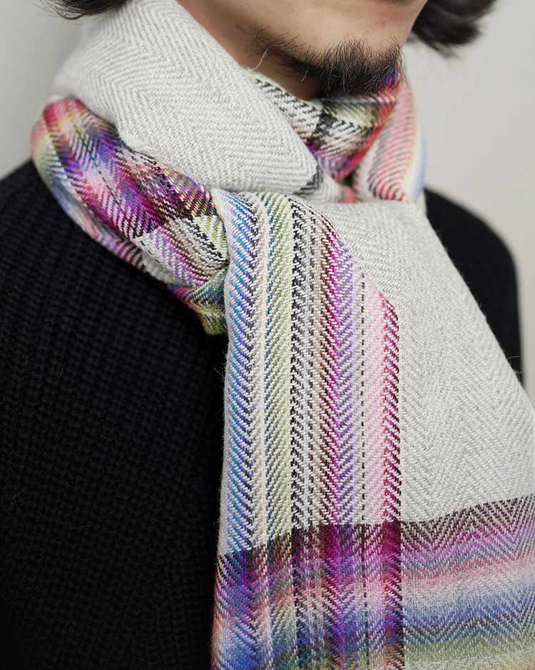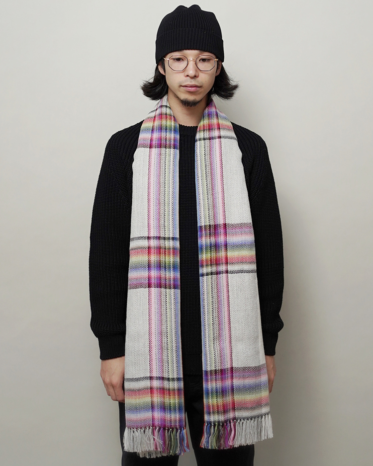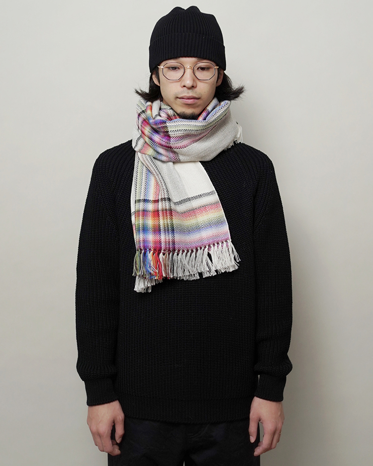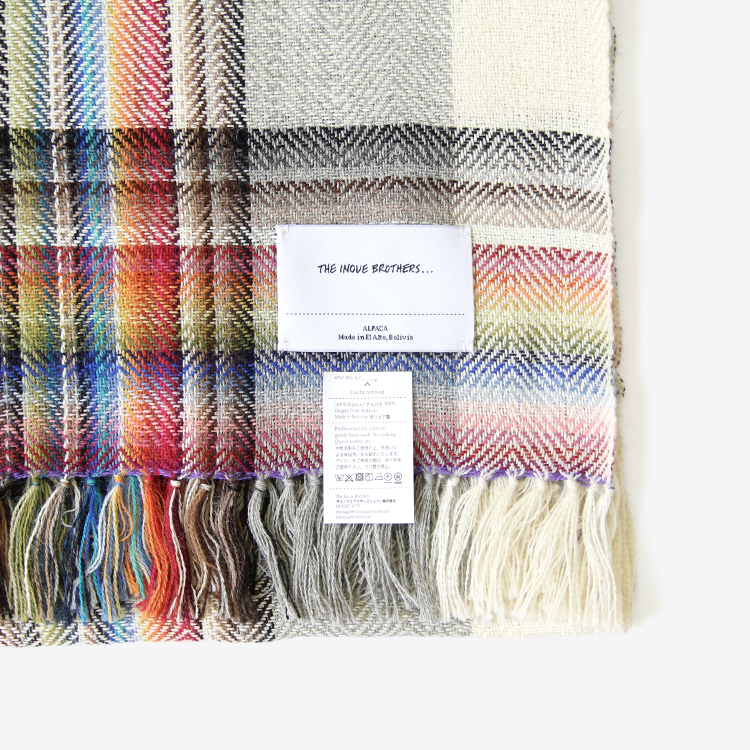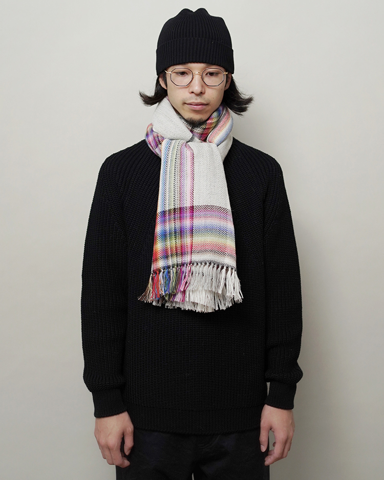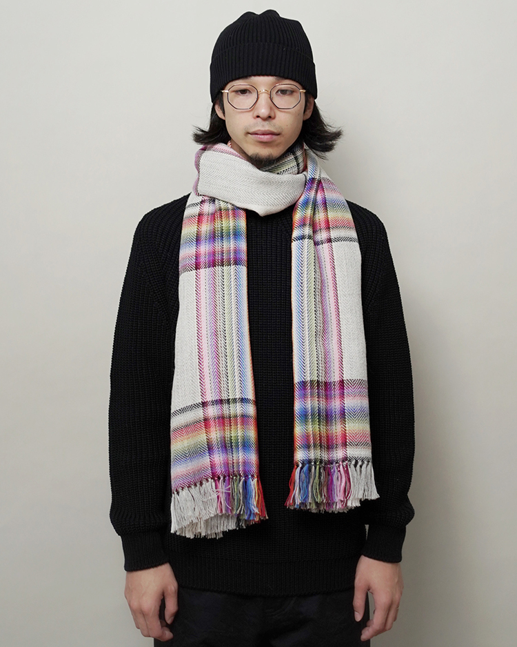 多数の色を織り交ぜた大判のストールです。ブランド立ち上げ当初から製造している定番のアイテム。アルパカを100%使用しているため肌触りが良く、暖かく使用して頂けます。