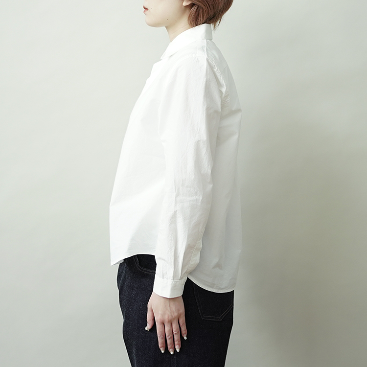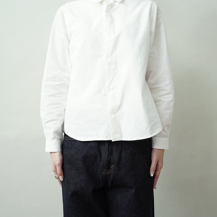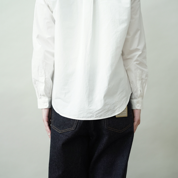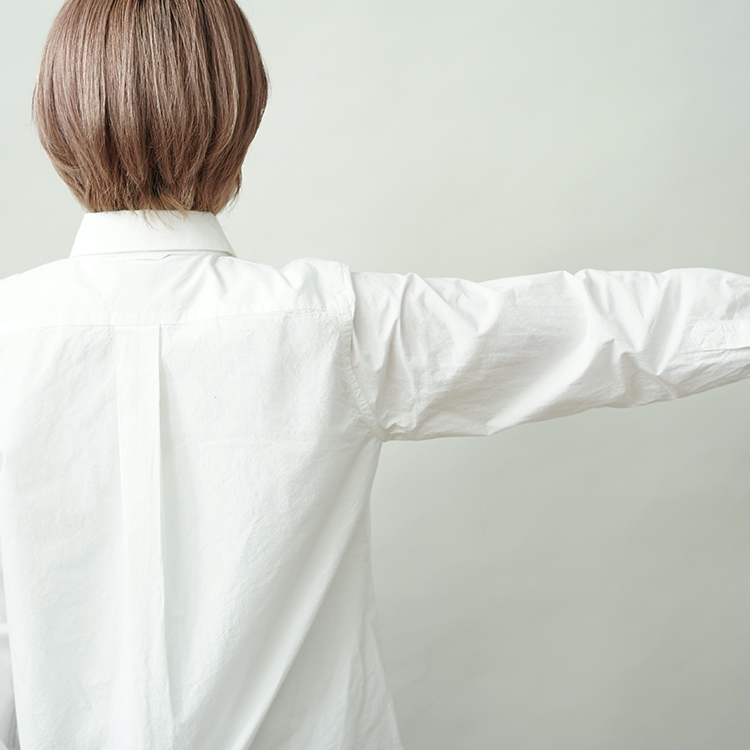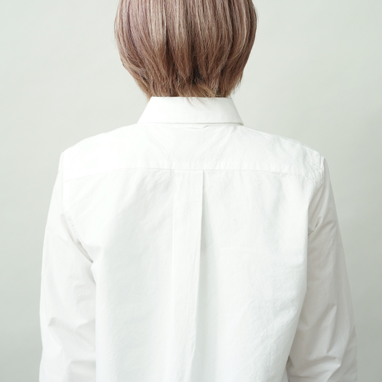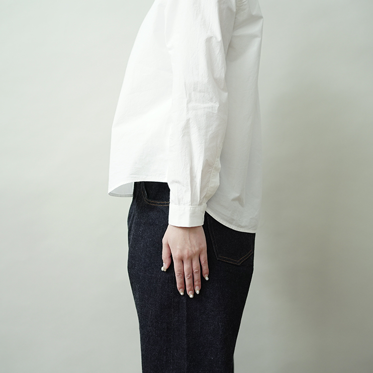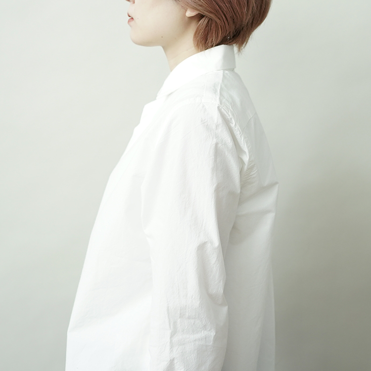 ペルー綿タイプライター生地を使用し、ノンアイロン・洗いざらしでも着られるように、あえて粗野に仕上げています。ディテールにもこだわったプロダクト的なアイテムです。