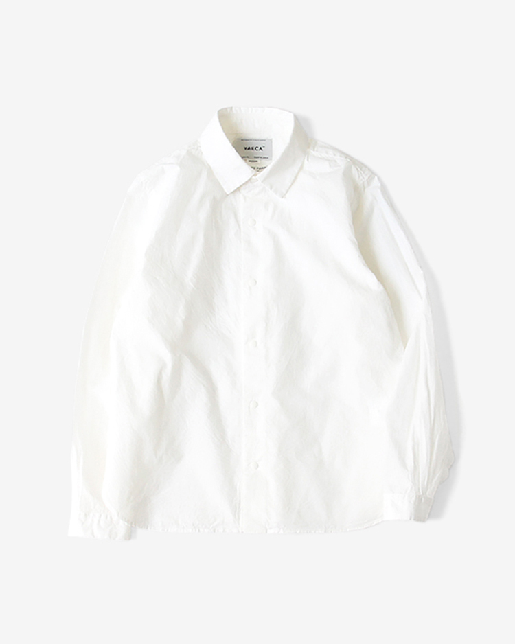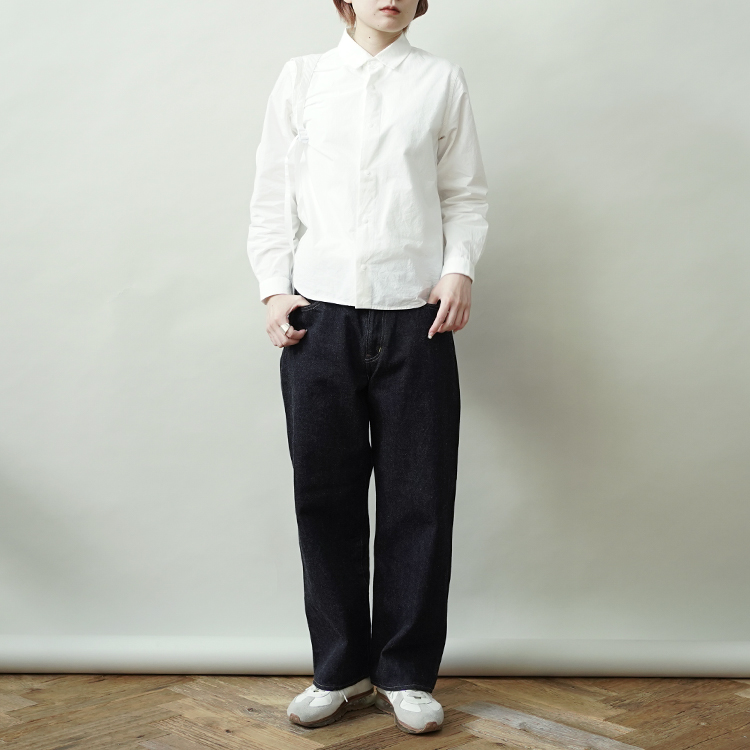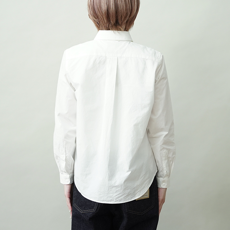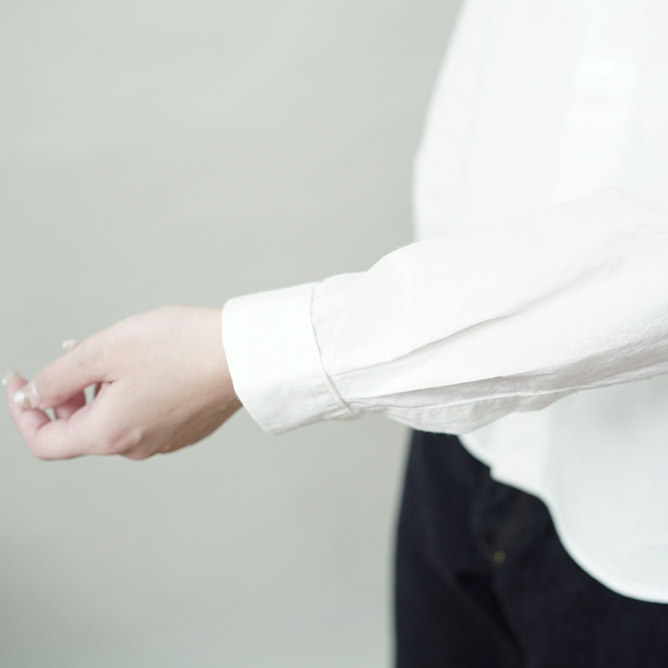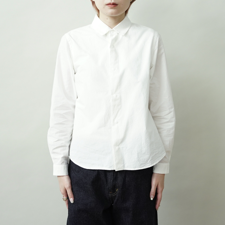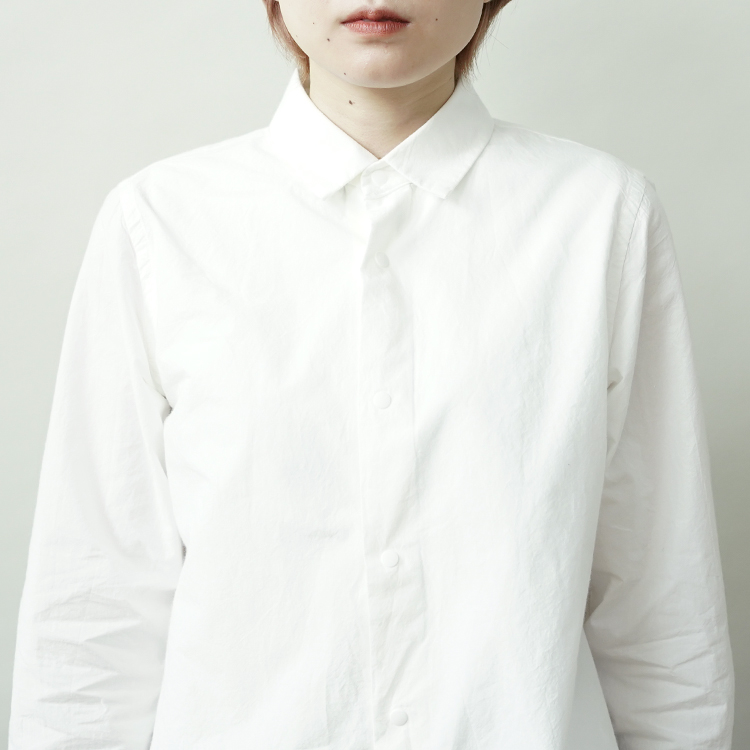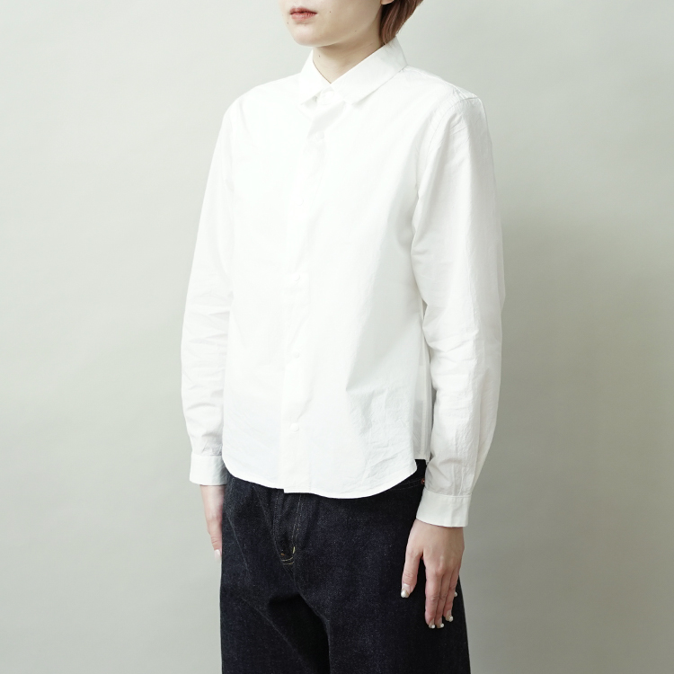ペルー綿タイプライター生地を使用し、ノンアイロン・洗いざらしでも着られるように、あえて粗野に仕上げています。ディテールにもこだわったプロダクト的なアイテムです。