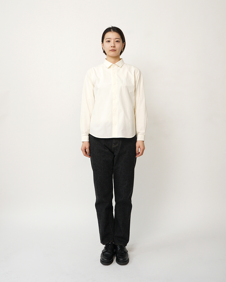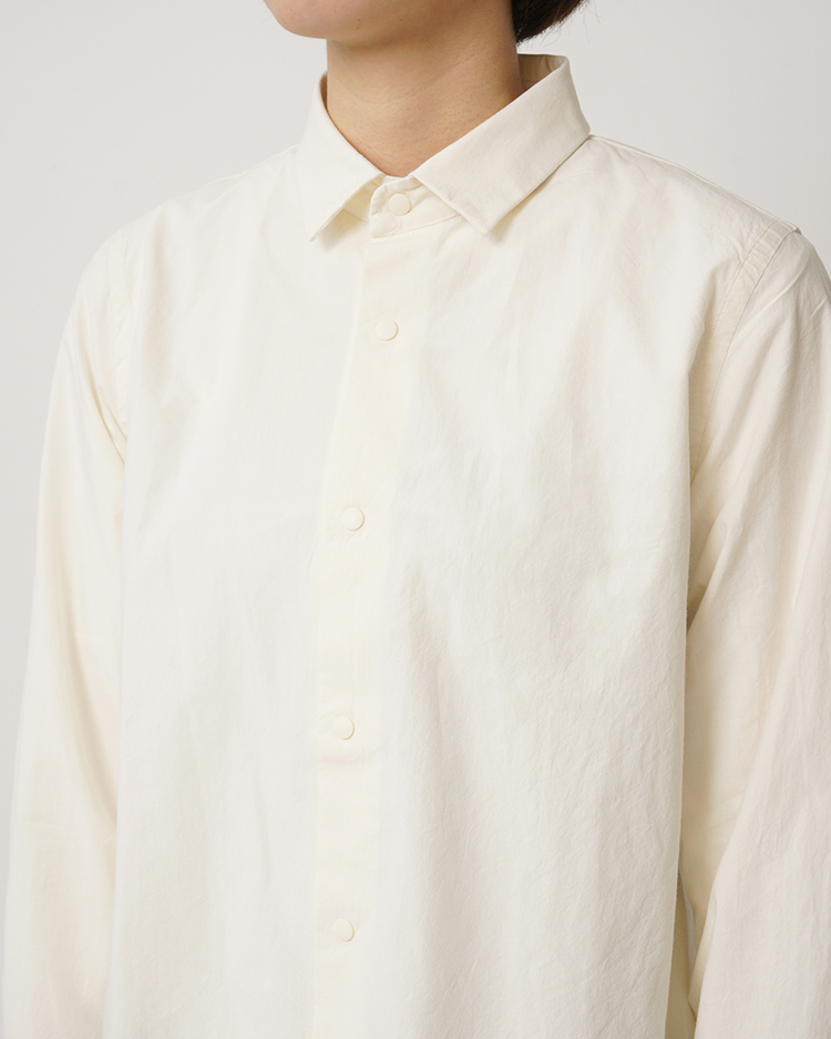 ほどよくコンパクトな身幅ですが、脇下にはマチをつけて、腕の動かしやすいシャツを仕立てました。着やすく脱ぎやすいスナップボタンがついています。