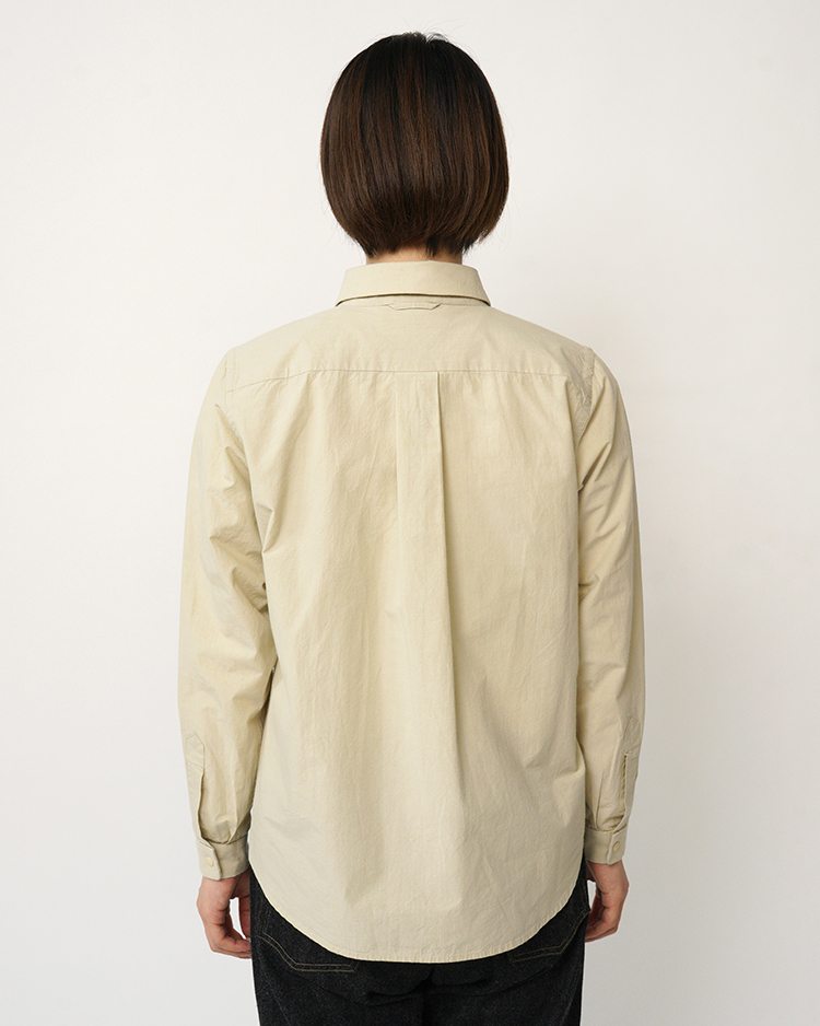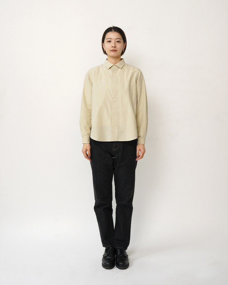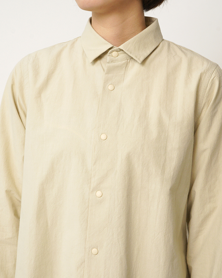 ほどよくコンパクトな身幅ですが、脇下にはマチをつけて、腕の動かしやすいシャツを仕立てました。着やすく脱ぎやすいスナップボタンがついています。