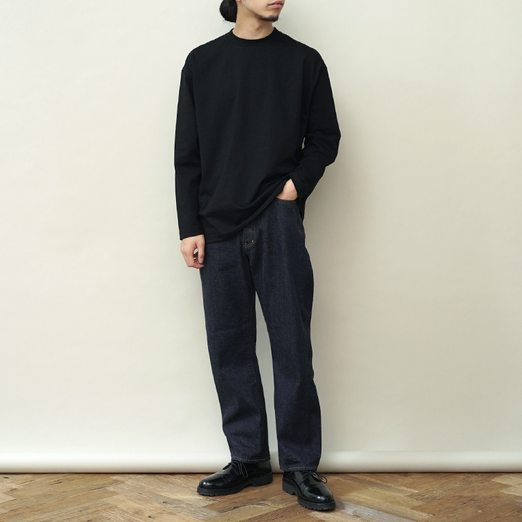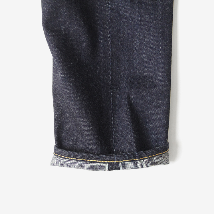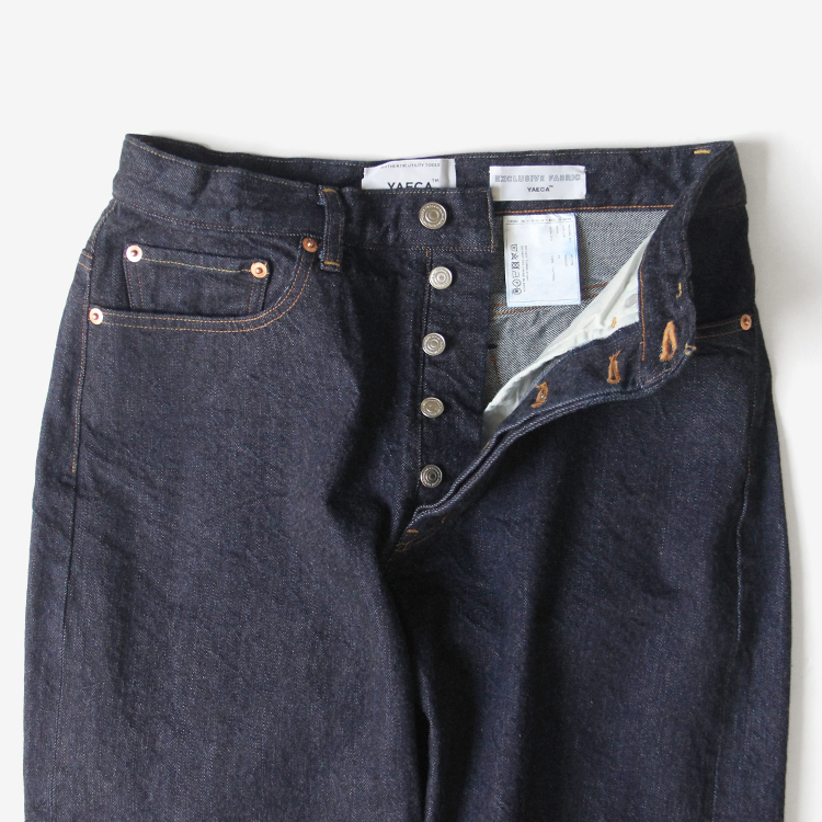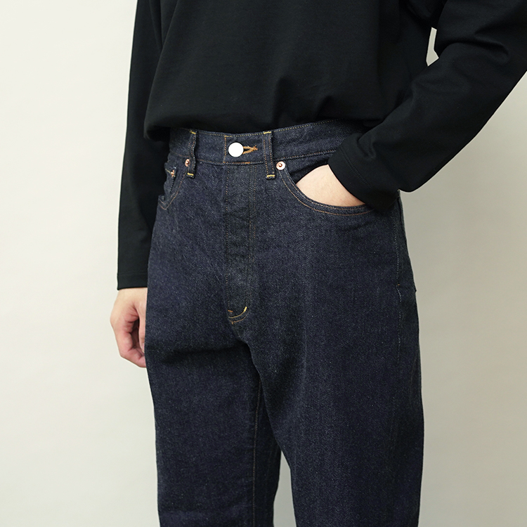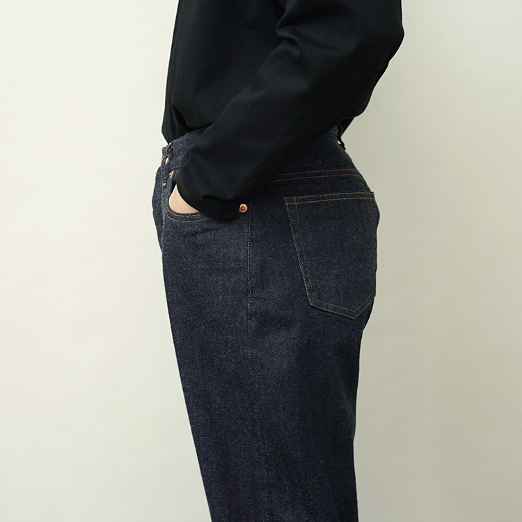 生地にハリがあり、ムラ感がなく一番綺麗な印象の13オンスのデニム生地を使用しました。YAECAのデニム生地の中では最も癖がなく、オーソドックスな生地です。