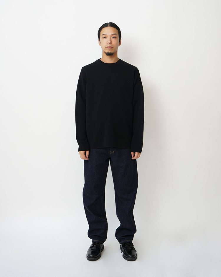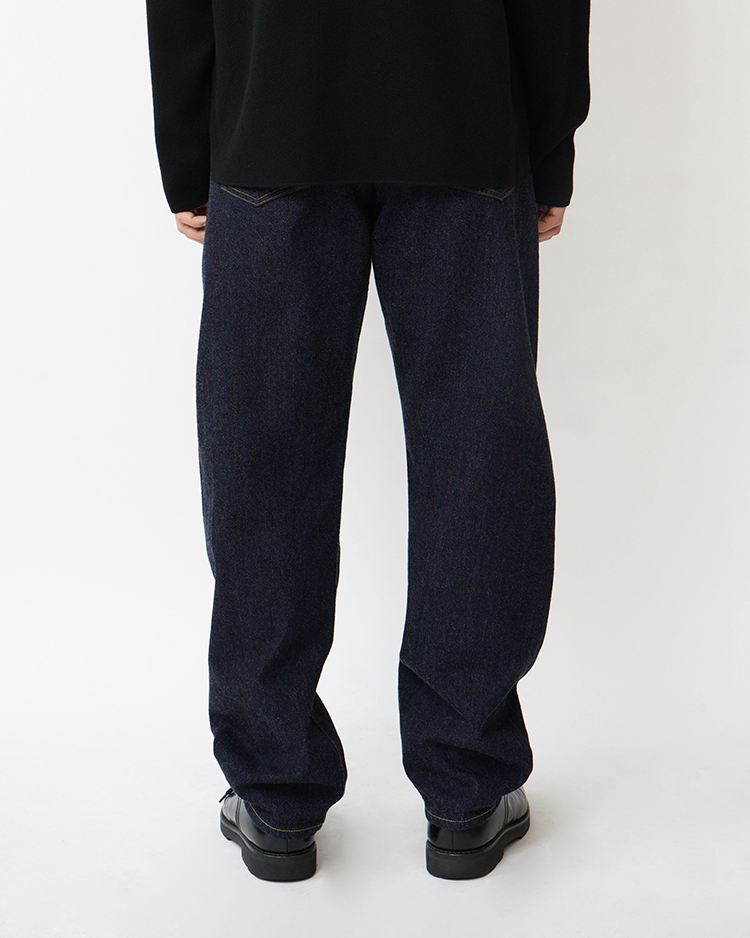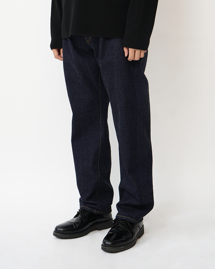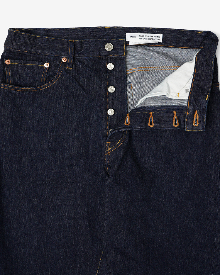 生地にハリがあり、ムラ感がなく一番綺麗な印象の13オンスのデニム生地を使用しました。YAECAのデニム生地の中では最も癖がなく、オーソドックスな生地です。