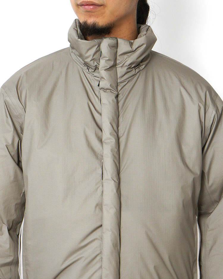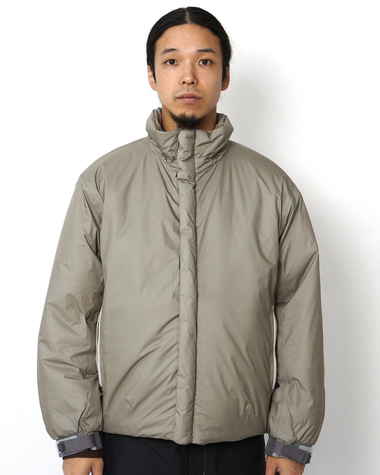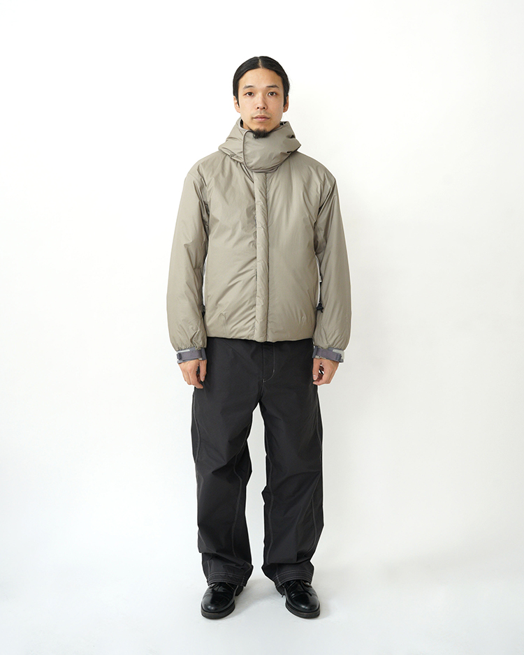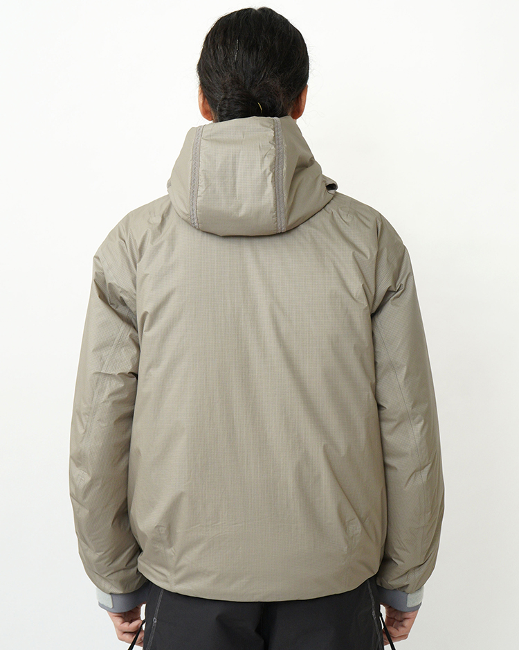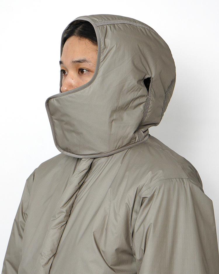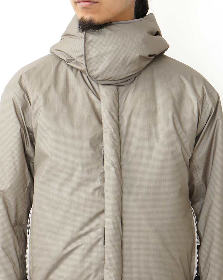 高機能素材をオーバーサイズの特徴的なコクーン型のシルエットで仕立てた軽量中わたアウター。WINDSTOPPER by GORE-TEX LABS 2層ラミネートの中で最軽量のリップストップ生地でPrimaLoftの中わたを包んでいます。内部はチタンスパッタリング加工を施し、輻射熱を発しやすくなる特性をもつ生地を一部に使用しています。背中には取り外し可能なインサレーテッドパックを設置。暖かさやボリュームを変化させて着用できます。フードも取り外し可能です。