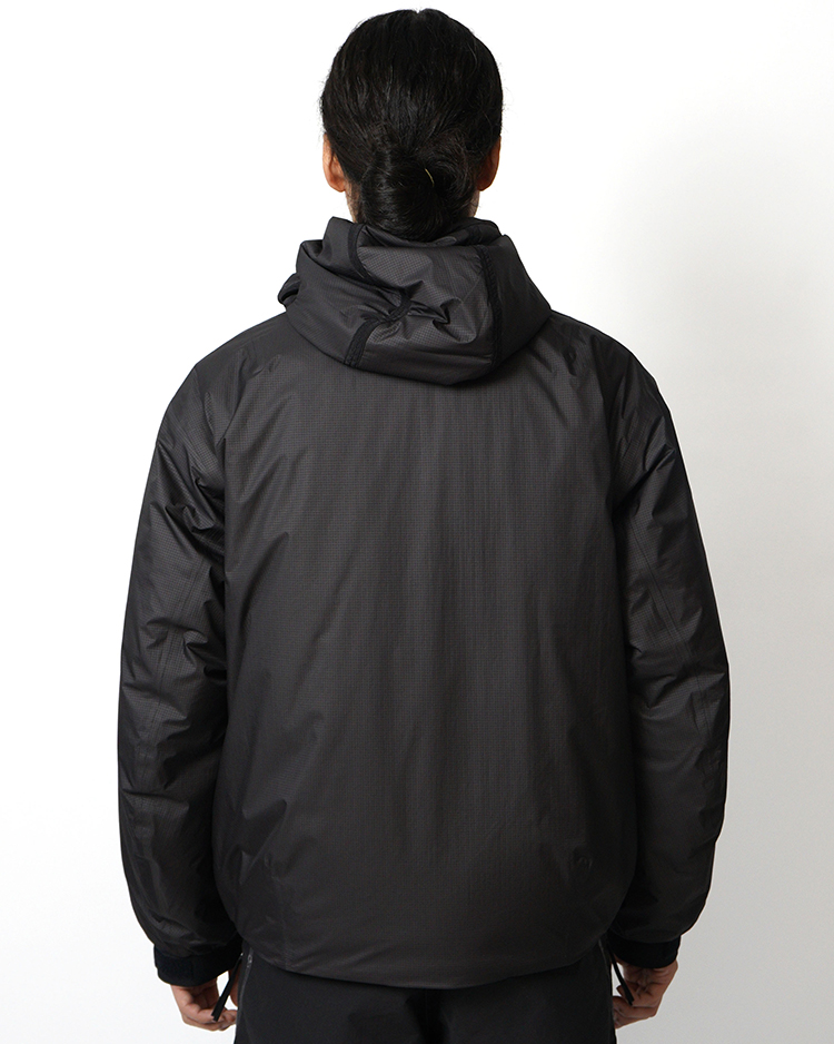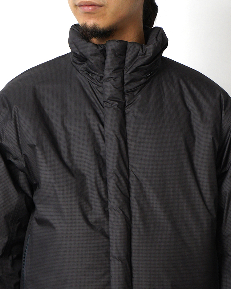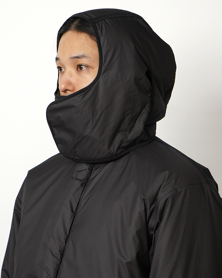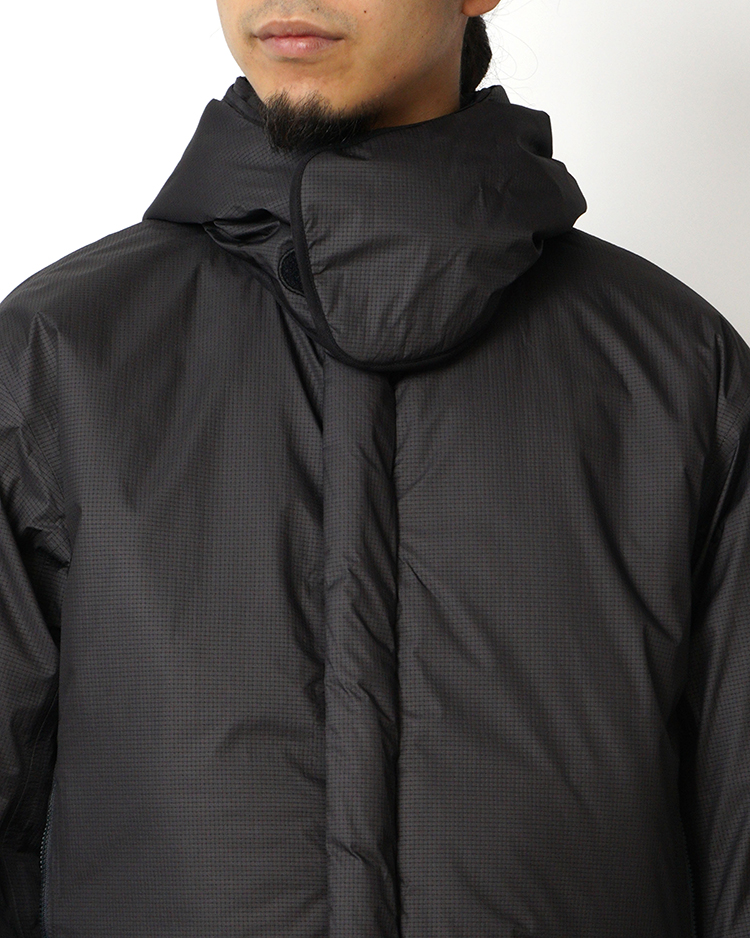 高機能素材をオーバーサイズの特徴的なコクーン型のシルエットで仕立てた軽量中わたアウター。WINDSTOPPER by GORE-TEX LABS 2層ラミネートの中で最軽量のリップストップ生地でPrimaLoftの中わたを包んでいます。内部はチタンスパッタリング加工を施し、輻射熱を発しやすくなる特性をもつ生地を一部に使用しています。背中には取り外し可能なインサレーテッドパックを設置。暖かさやボリュームを変化させて着用できます。フードも取り外し可能です。