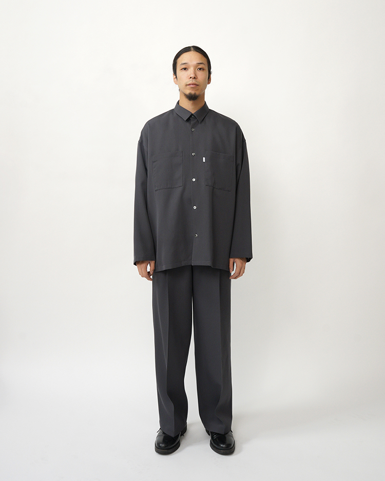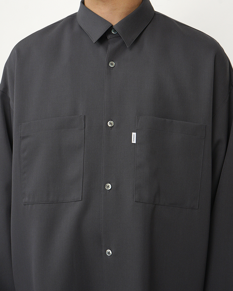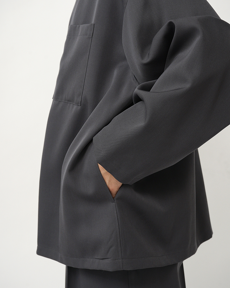 最も美しい綾目を表現するため縦糸を高密度に、横糸は限界まで打ち込んだウールギャバジン。特殊な樹脂をウール繊維の内部まで染み込ませることでフィラメントのような光沢とクリアな質感を生む。定番のオーバーサイズボックスシャツをベースにした総裏仕様のロングスリーブ。