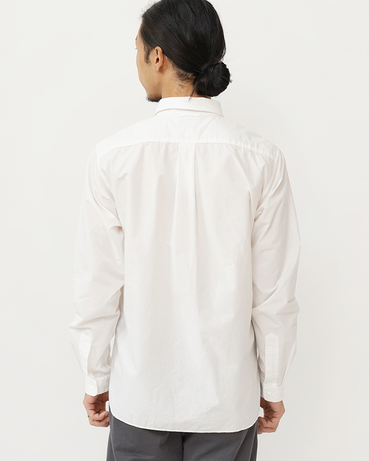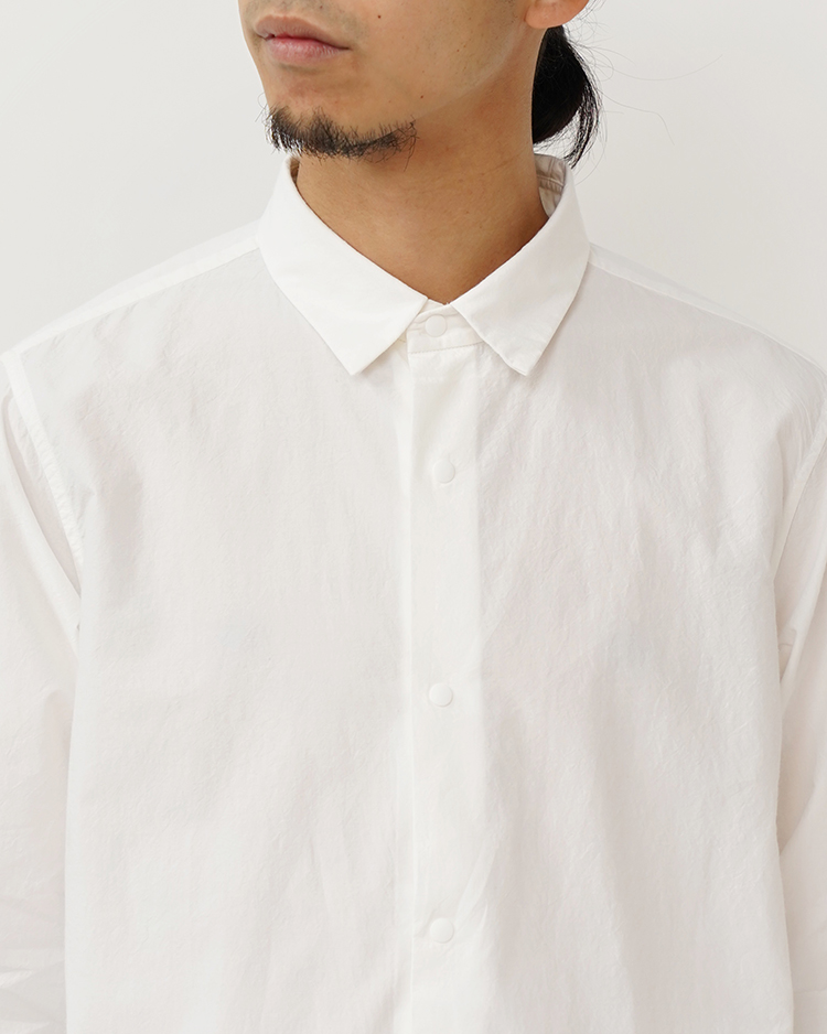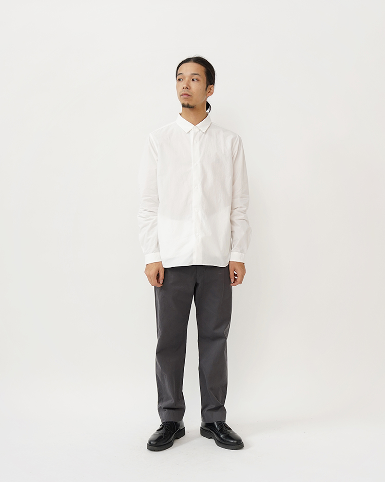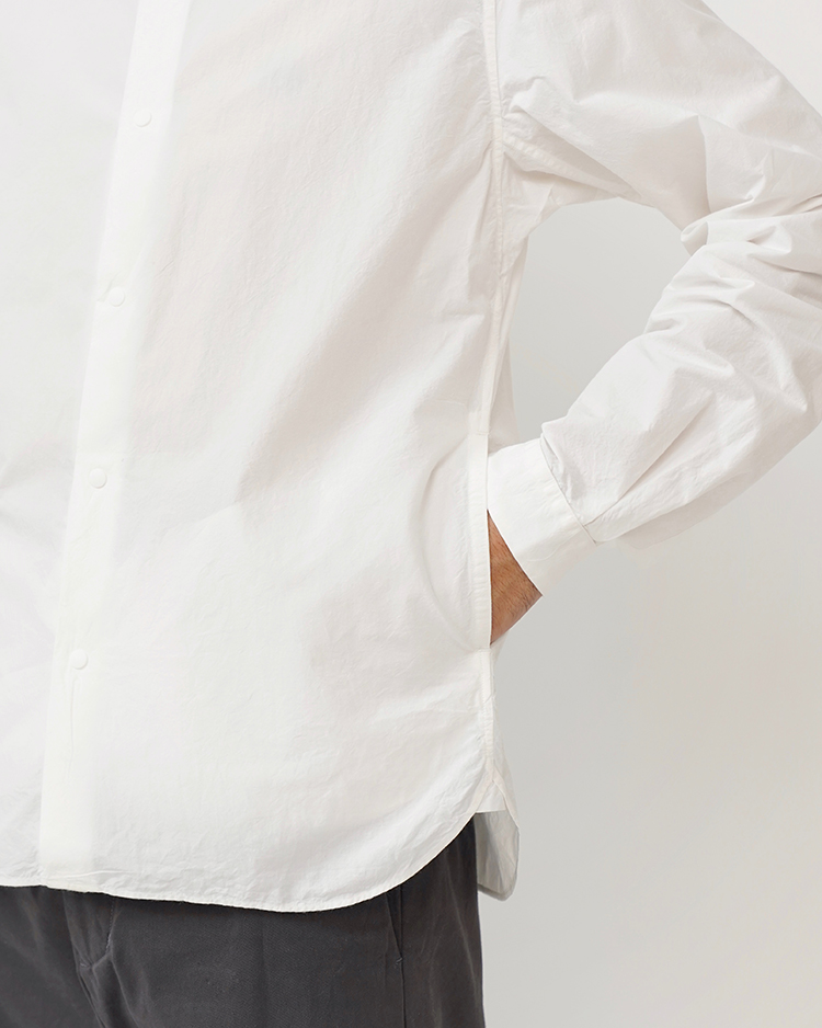 ペルー綿タイプライター生地を使用し、ノンアイロン・洗いざらしでも着られるように、あえて粗野に仕上げています。両裾にハンドポケットを配す等、ディテールにもこだわったプロダクト的なアイテムです。