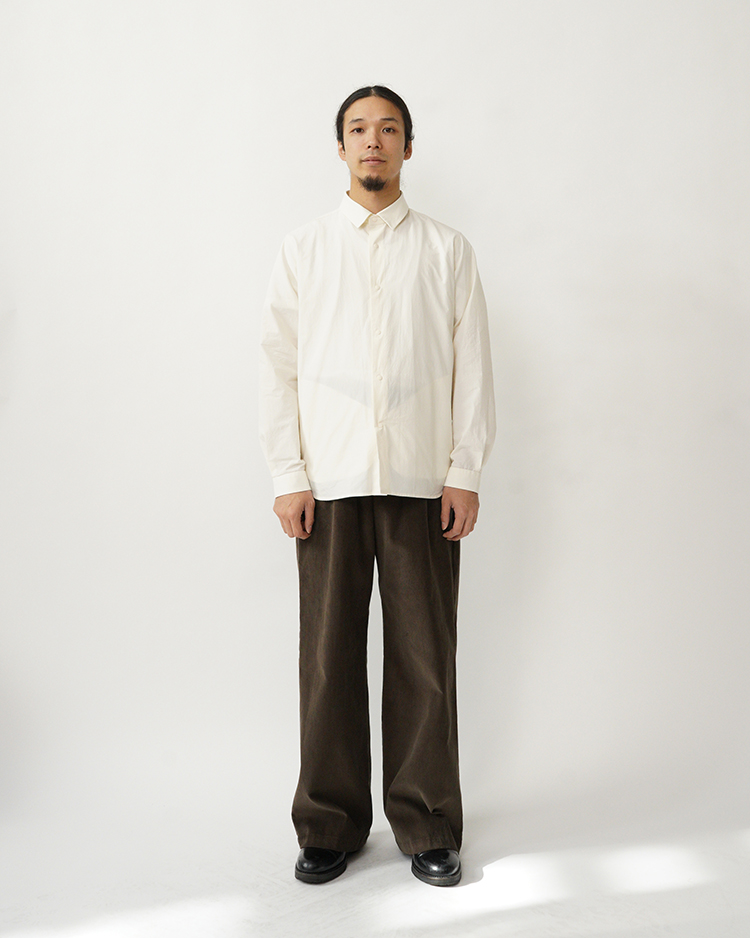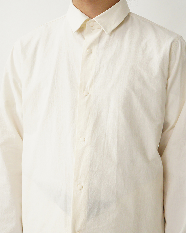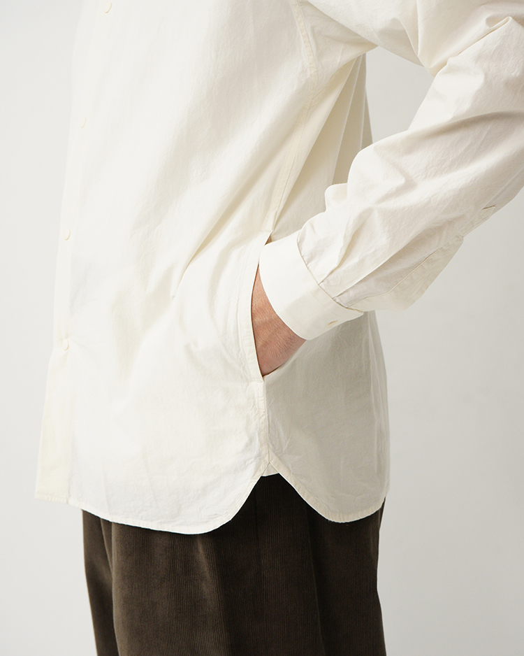 ほどよくコンパクトな身幅ですが、脇下にはマチをつけて、腕の動かしやすいシャツを仕立てました。着やすく脱ぎやすいスナップボタン、両サイドにはポケットがついています。