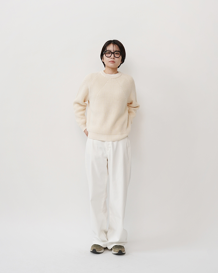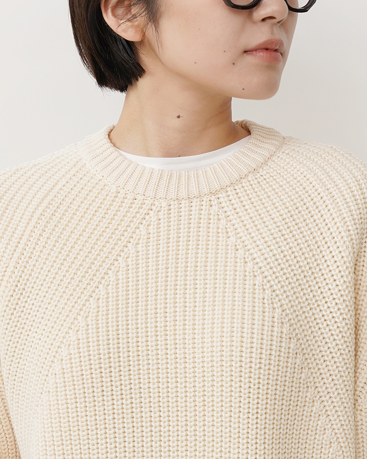 SOLID WOOLという独自に開発した糸を使用し、キレイな編目・ダレない強度・毛玉ができにくい・チクチクしないという理想のミドルゲージニットを目指した商品となっております。