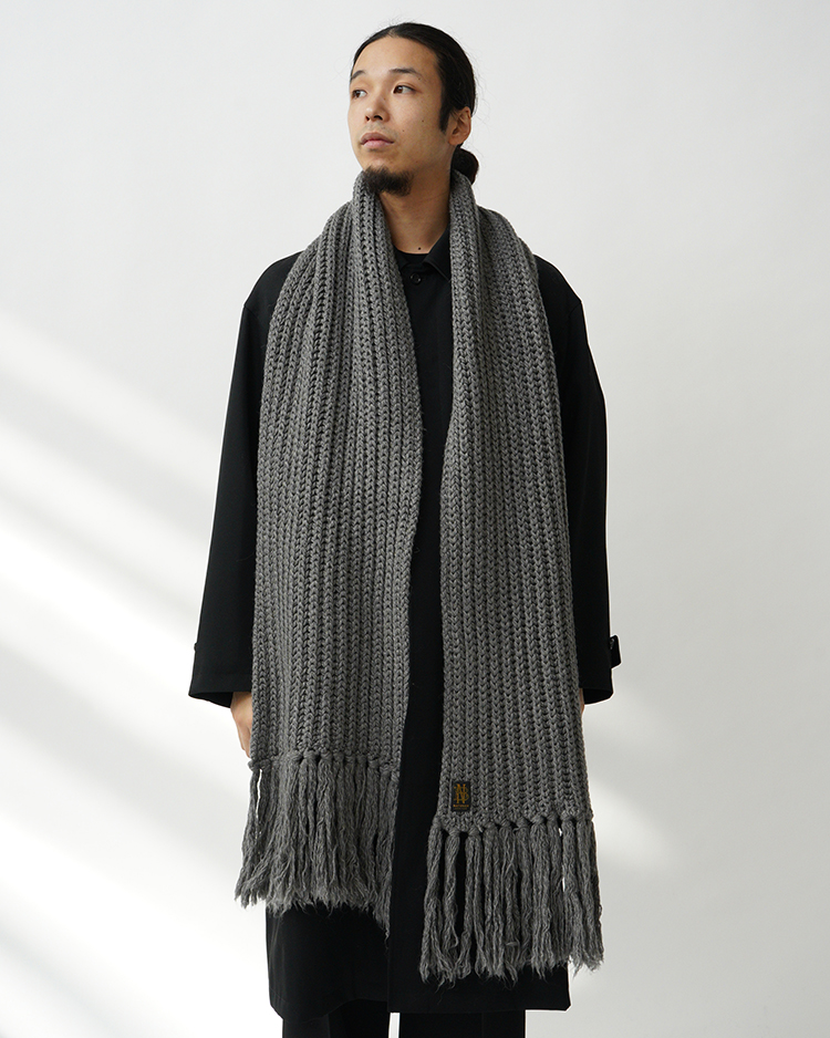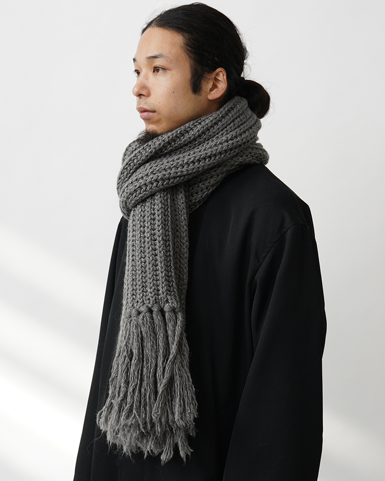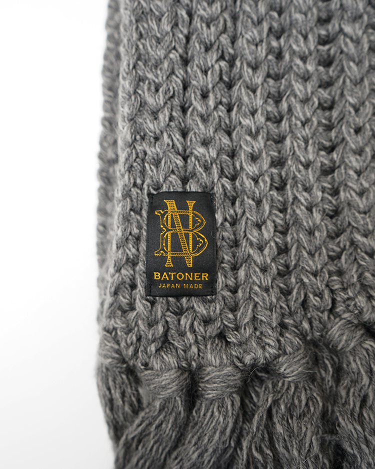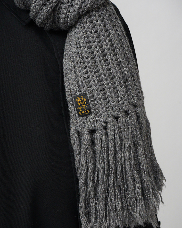 ローゲージでふっくらと編立てたBATONER定番のフリンジマフラー。膨らみの強い太番手の紡績したメリノウールに、柔らかく優しい肌触りのベビーアルパカと光沢感のあるシルクをブレンドした糸を使用。