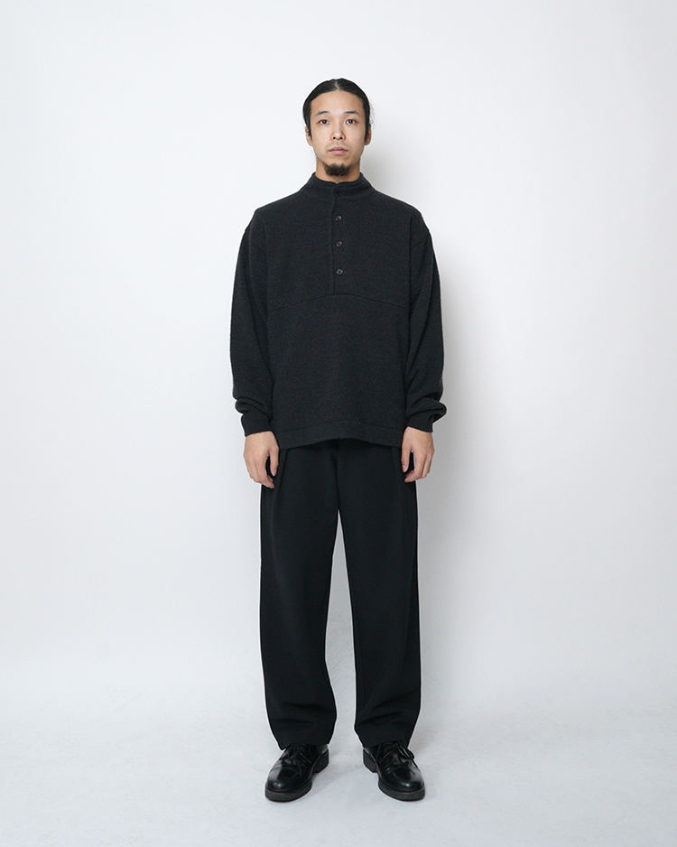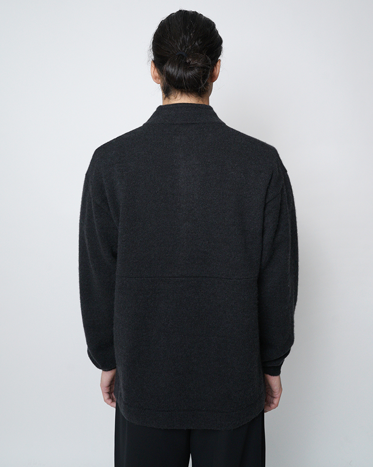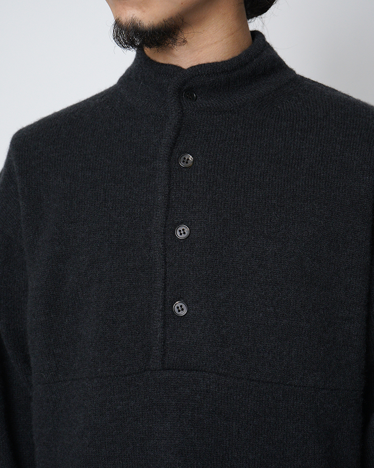 英国羊毛の中で最も繊細な繊度を誇るブルーフェイスウール100%のニット。粗野な表情を持ちながらも、英国羊毛らしい弾力のあるふくらみと軽やかな着心地が魅力。裾にスリット入り。