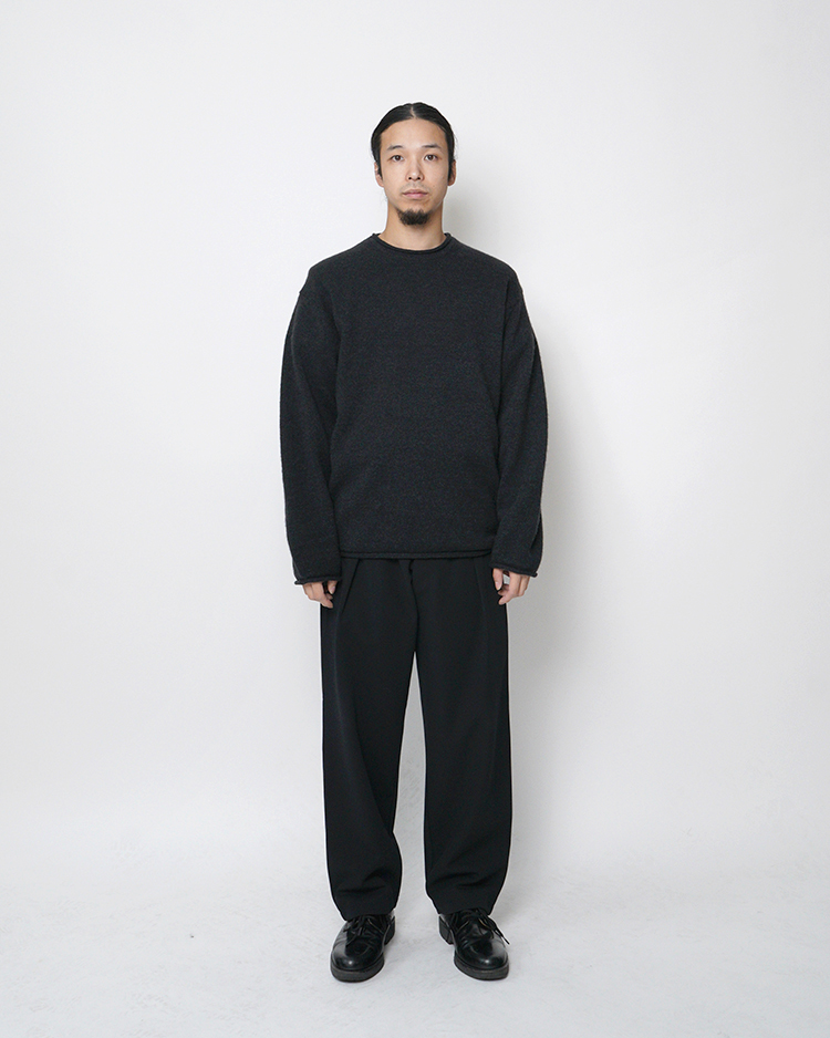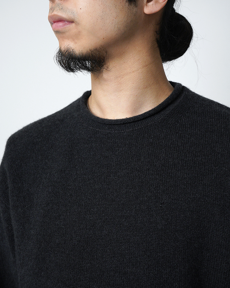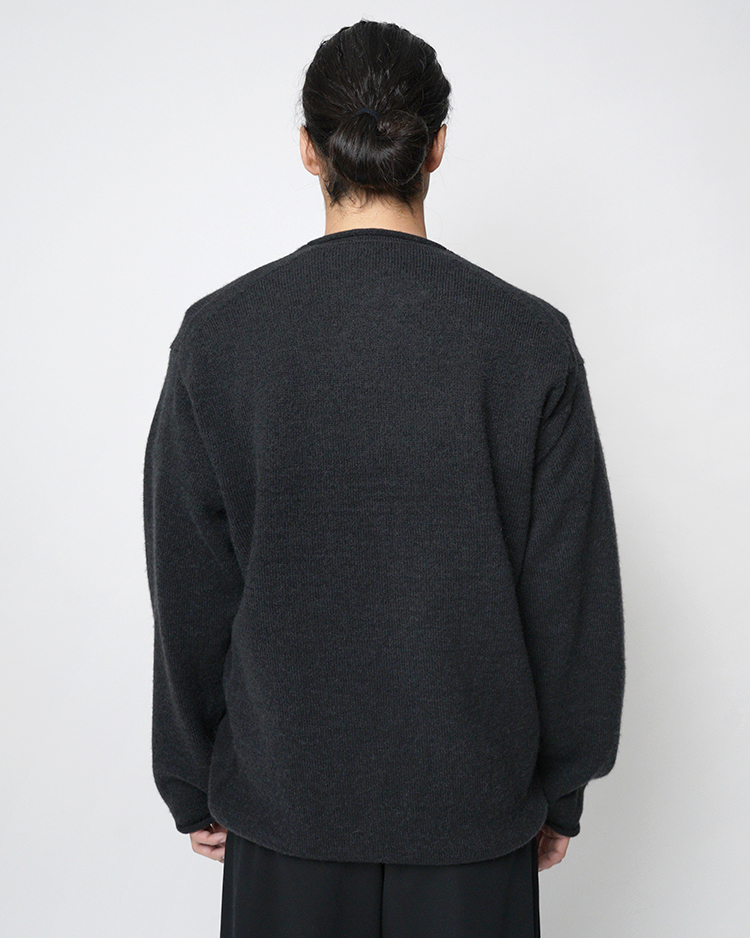 英国羊毛の中で最も繊細な繊度を誇るブルーフェイスウール100%のニット。粗野な表情を持ちながらも、英国羊毛らしい弾力のあるふくらみと軽やかな着心地が魅力。襟、袖口、裾がロールアップ仕様。