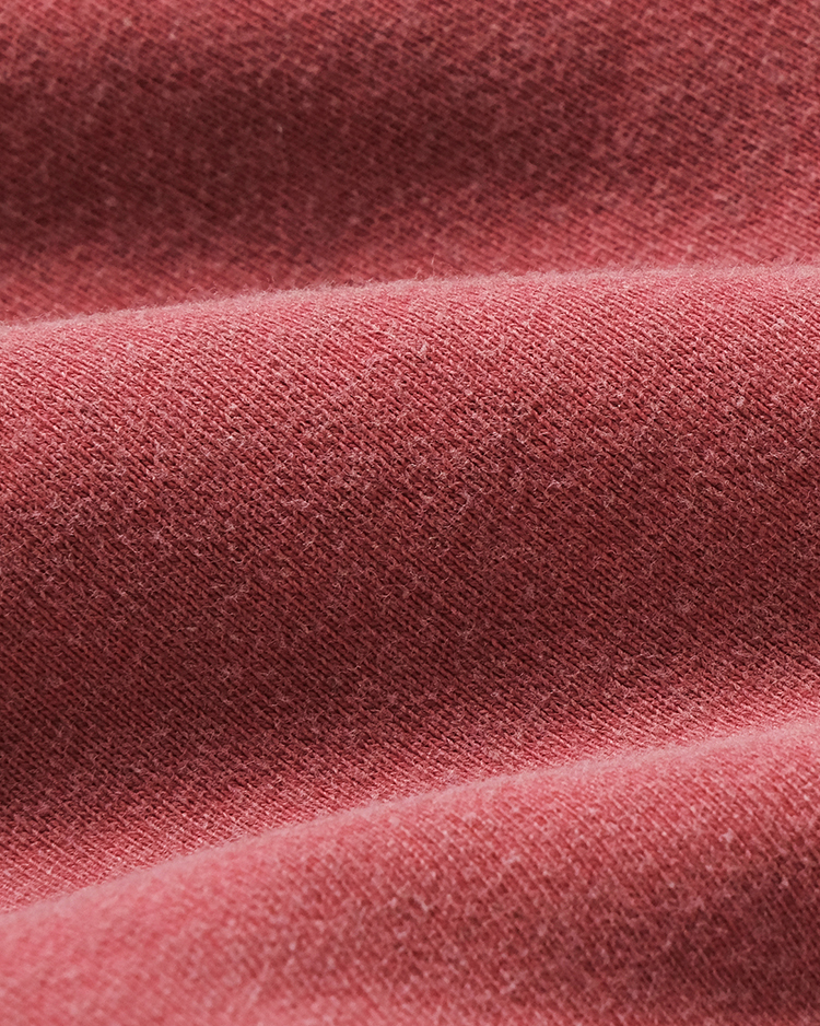 希少な旧式編機“ジャンベルカ”を使用し、時間をかけて丁寧に編むことで独特のキックバック性と程よい肉感のある商品。表側に空気紡績糸を使用し、軽さとタフさを持たせ、裏側にはソフトな糸を使用。裏起毛をしないことで軽やかに仕上げた商品。後染め加工を施し、その後に色を落とすことで独自のフェード感を実現した商品。