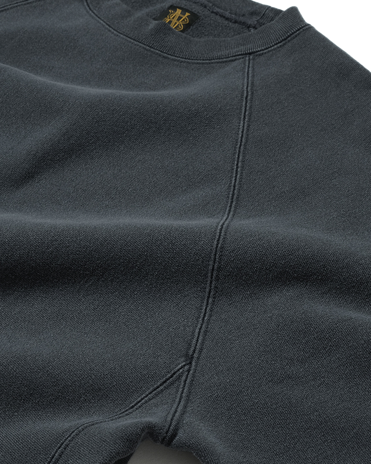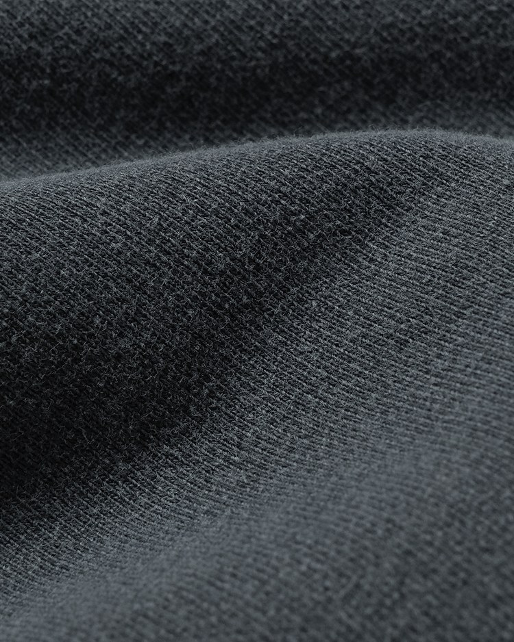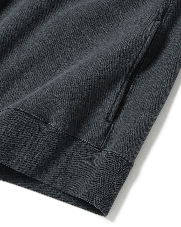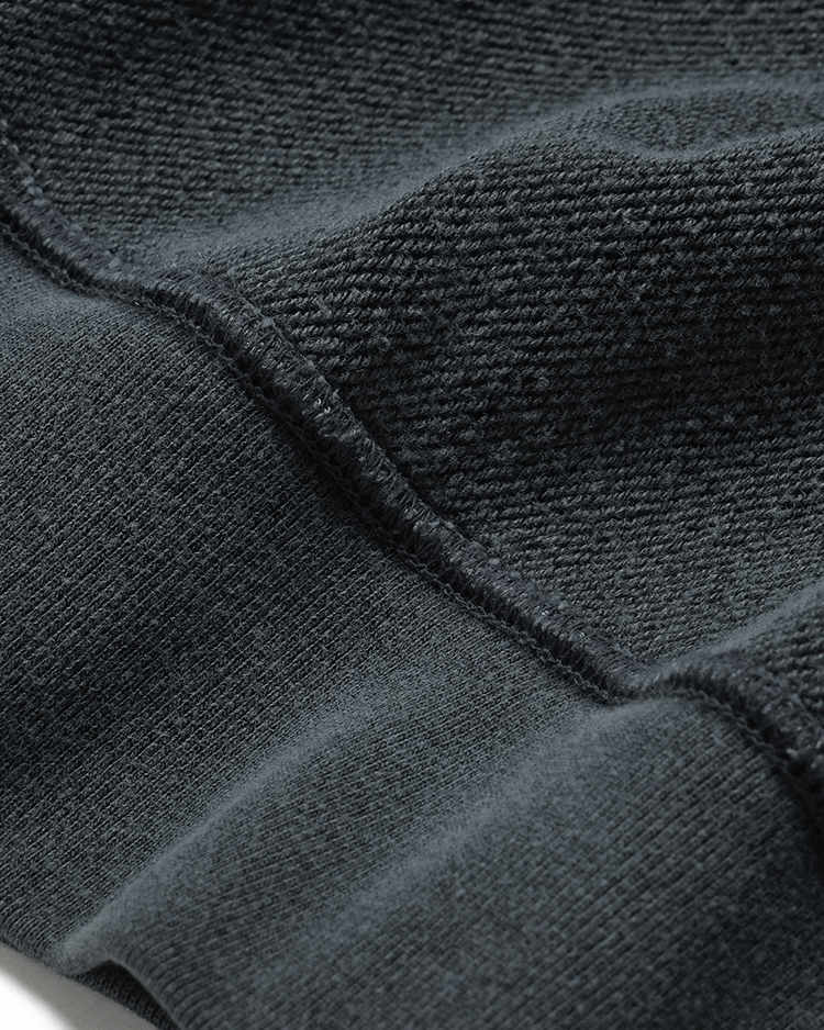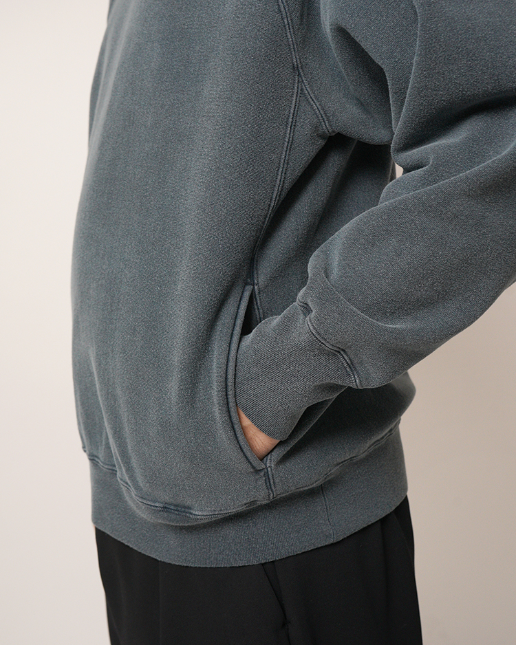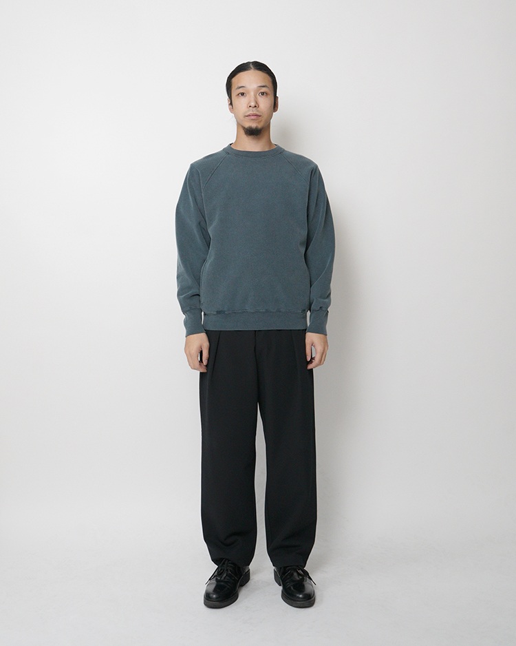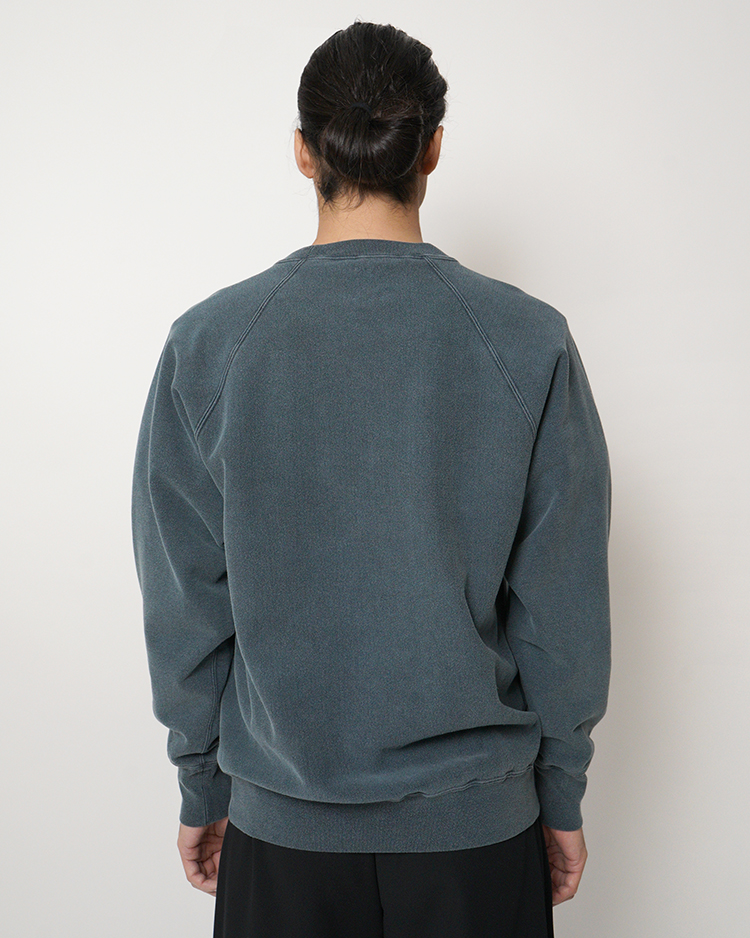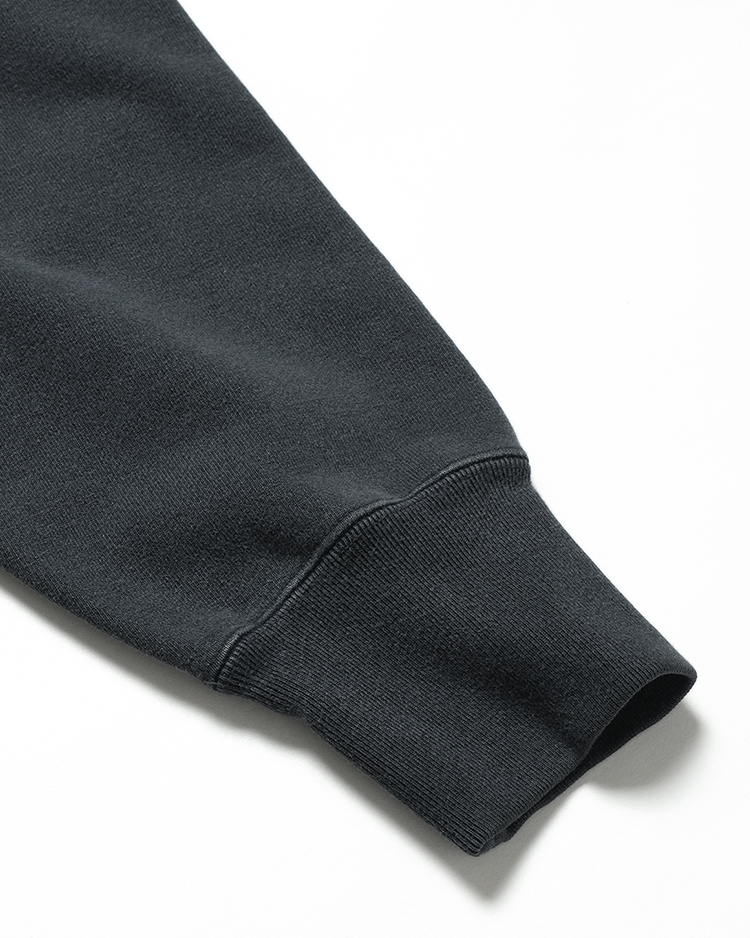 希少な旧式編機“ジャンベルカ”を使用し、時間をかけて丁寧に編むことで独特のキックバック性と程よい肉感のある商品。表側に空気紡績糸を使用し、軽さとタフさを持たせ、裏側にはソフトな糸を使用。裏起毛をしないことで軽やかに仕上げた商品。後染め加工を施し、その後に色を落とすことで独自のフェード感を実現した商品。