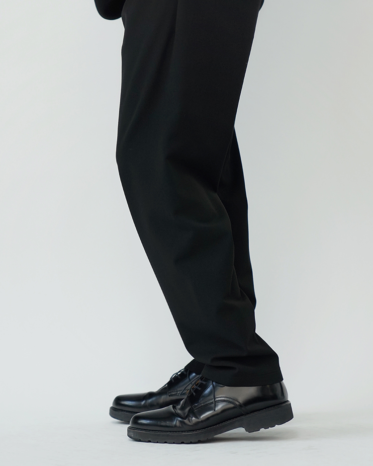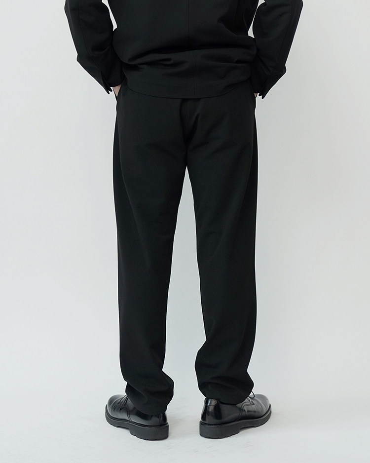 太ももにゆとりを持たせ、ウエストにドローコードを配したテーパードシルエットのイージースラックスです。