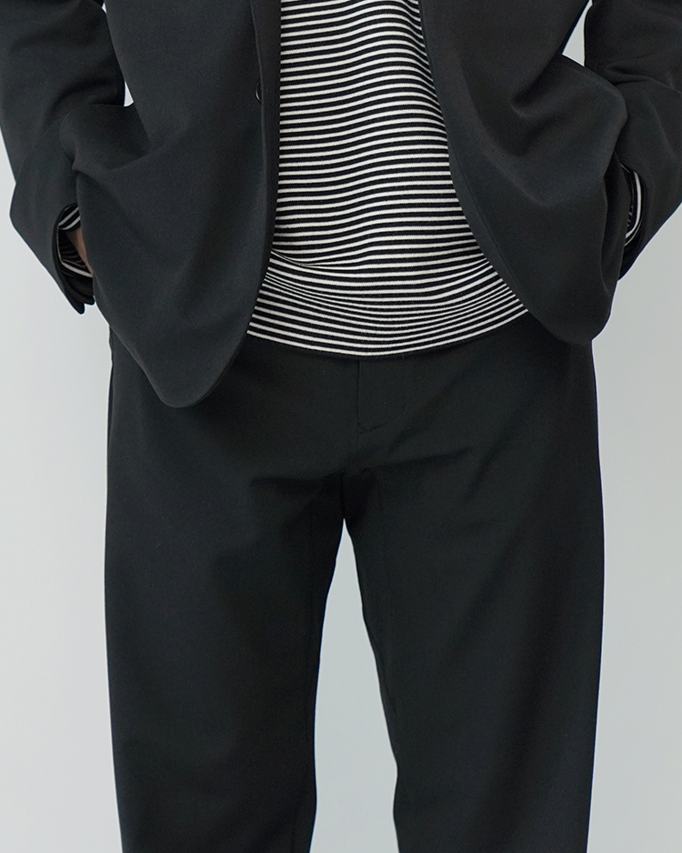 ポリエステル/レーヨン/ポリウレタンを混紡したストレッチ生地を使用しました。オールシーズン着用可能なハリコシのある生地になります。