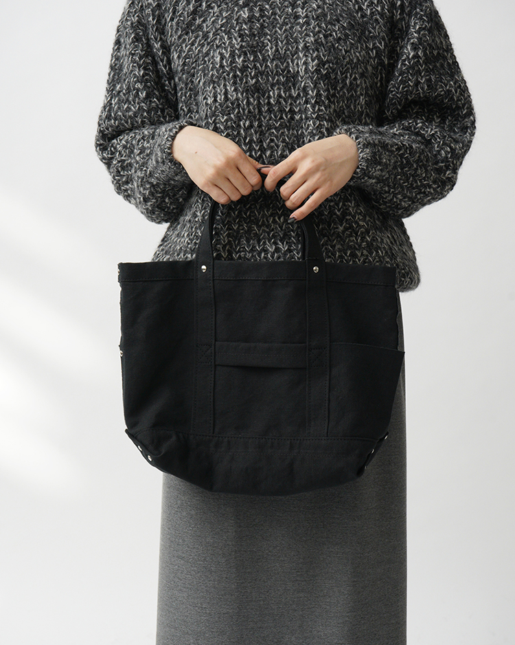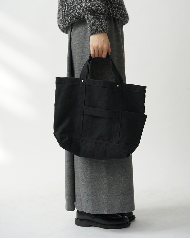 中底にはナイロン素材の生地を当てることで防水性を持たせ、負荷の強くかかるマチ部分にはリベットで補強がなされています。また内外三カ所に配置されたポケットには小物やペットボトル等を収納可能です。