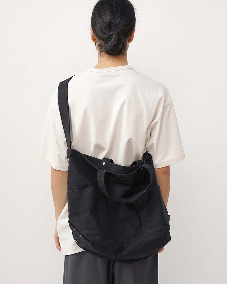 中底にはナイロン素材の生地を当てることで防水性を持たせ、負荷の強くかかるマチ部分にはリベットで補強がなされています。また内外三カ所に配置されたポケットには小物やペットボトル等を収納可能です。