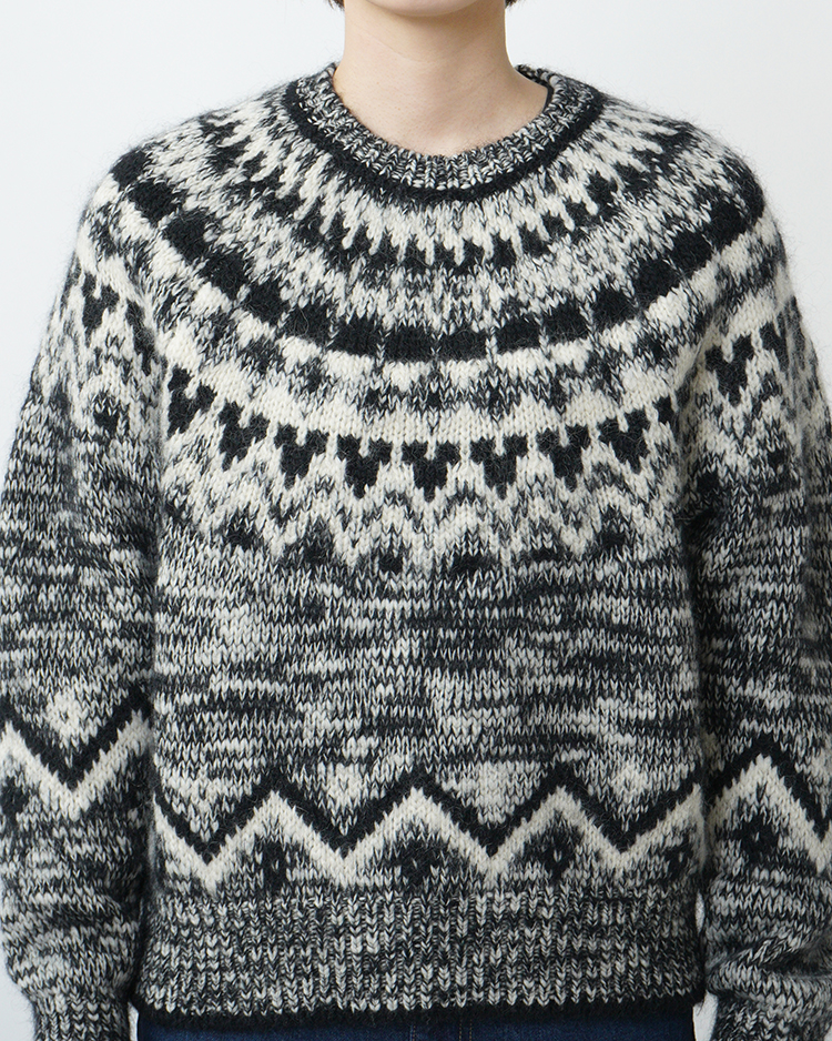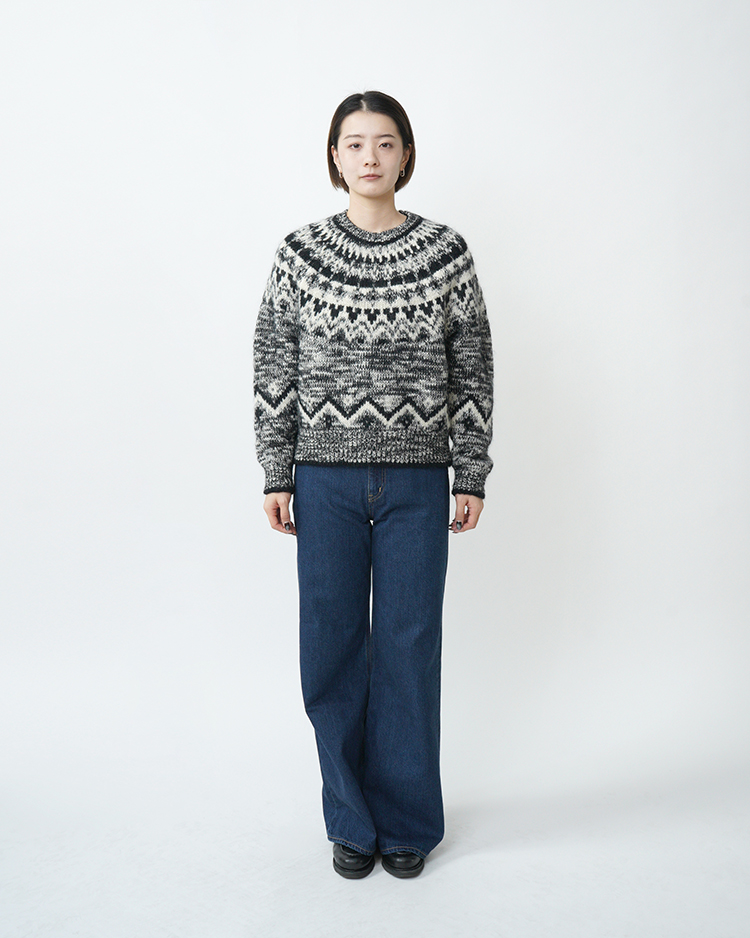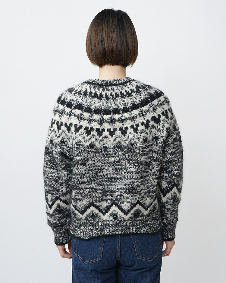 モヘヤ、アルパカ、ウールの天然素材をブレンドした糸に、太番手のスラブヤーンをミックスして編み立てました。モヘヤ、アルパカの起毛感は保ちつつ、スラブヤーンならではのランダムな四凸感が特徴。