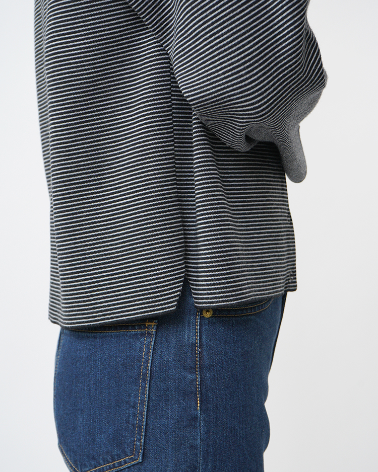時間をかけて丁寧に編むため、一日に仕上がるのはわずか数枚。ほかの編立機では再現できない繊細な工程を経ており、伸縮性がありリラックスした着心地ながら、型崩れしにくい。