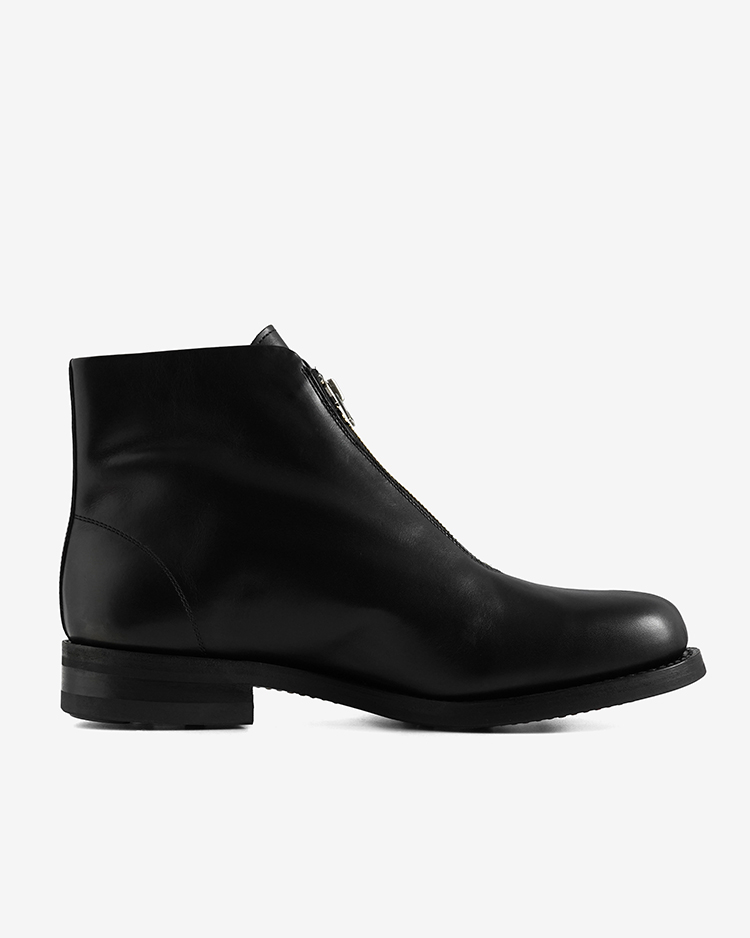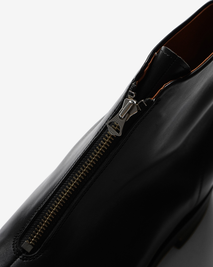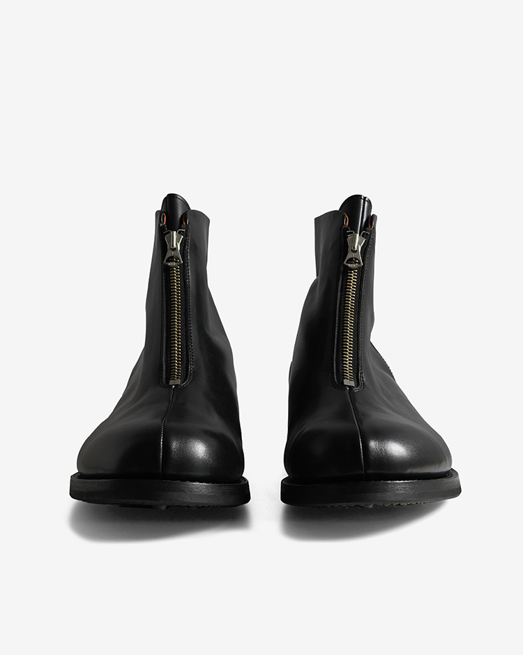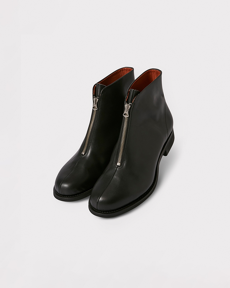 ビンテージを参考に製作したフロントジップアップブーツ。 カーフボックスレザーを使用。
