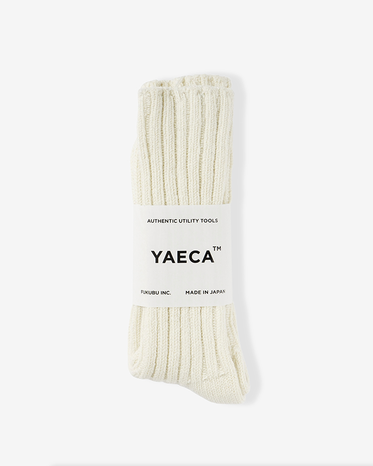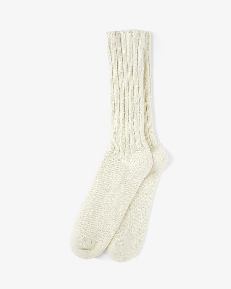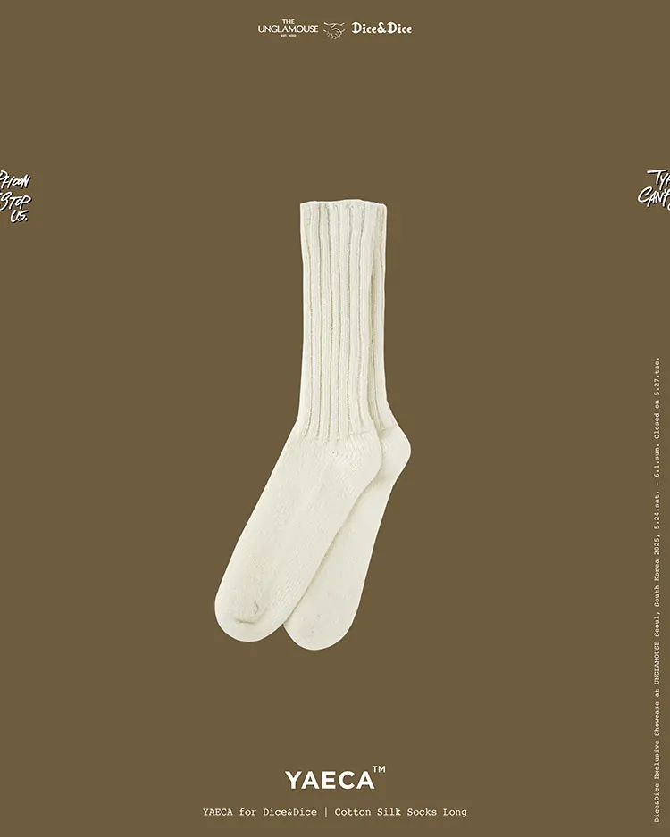 旧式の編み機を用いて編み立てた、ローゲージ仕様のロングソックスです。 コットンにシルクを混紡した肉厚な素材を採用し、ふっくらとした質感と快適 な履き心地を両立しています。コットンニットのような編み地で構成され、つま先などの接合部にはリンキング縫製を用いるなど、細部まで丁寧に仕上げられています。裏地には重なりがなく、縫い代のストレスを抑えた設計。ゴムを使用せず、編み地本来の自然なフィット感によって足を包み込む仕様です。本製品は、通常コットンシルクソックスでは展開にないNATURALカラーで製作されたDice&Dice別注モデルです。