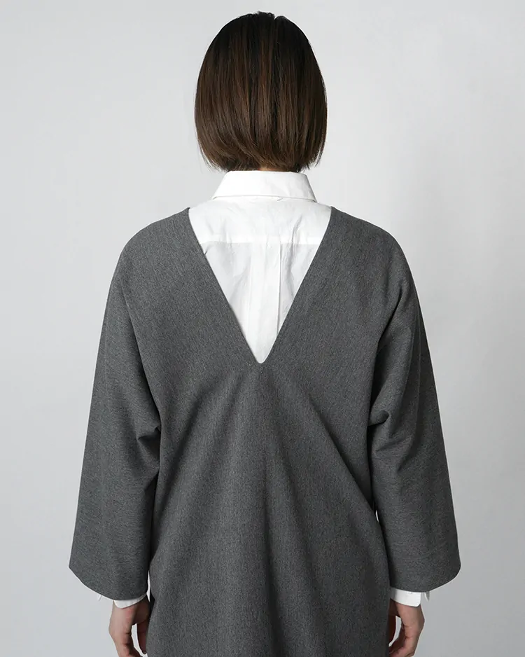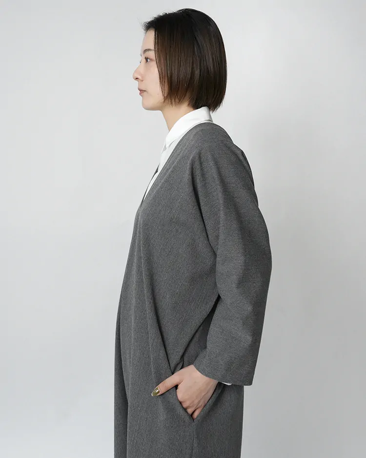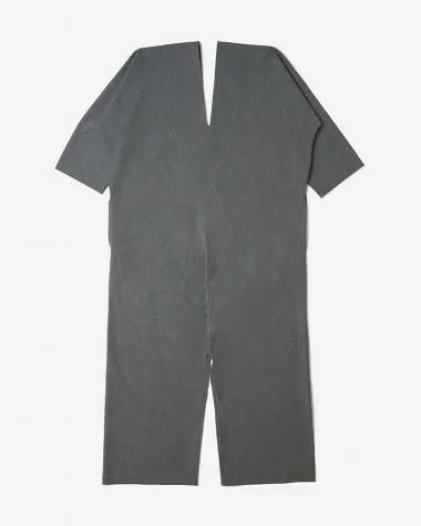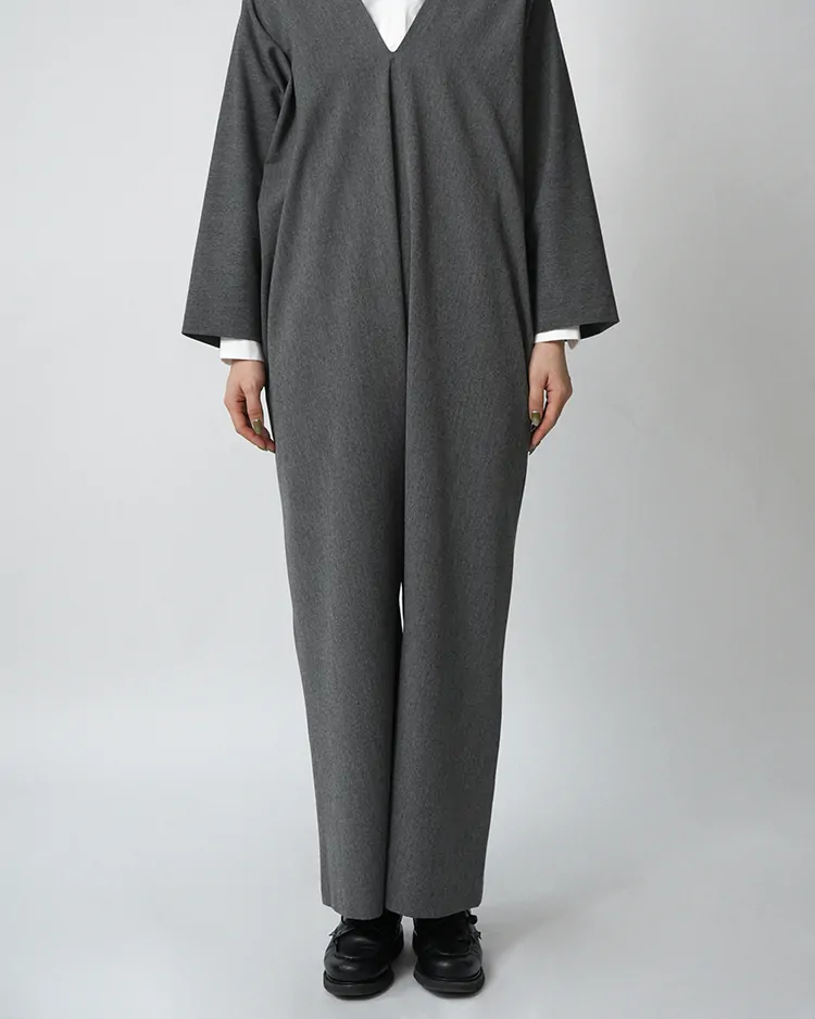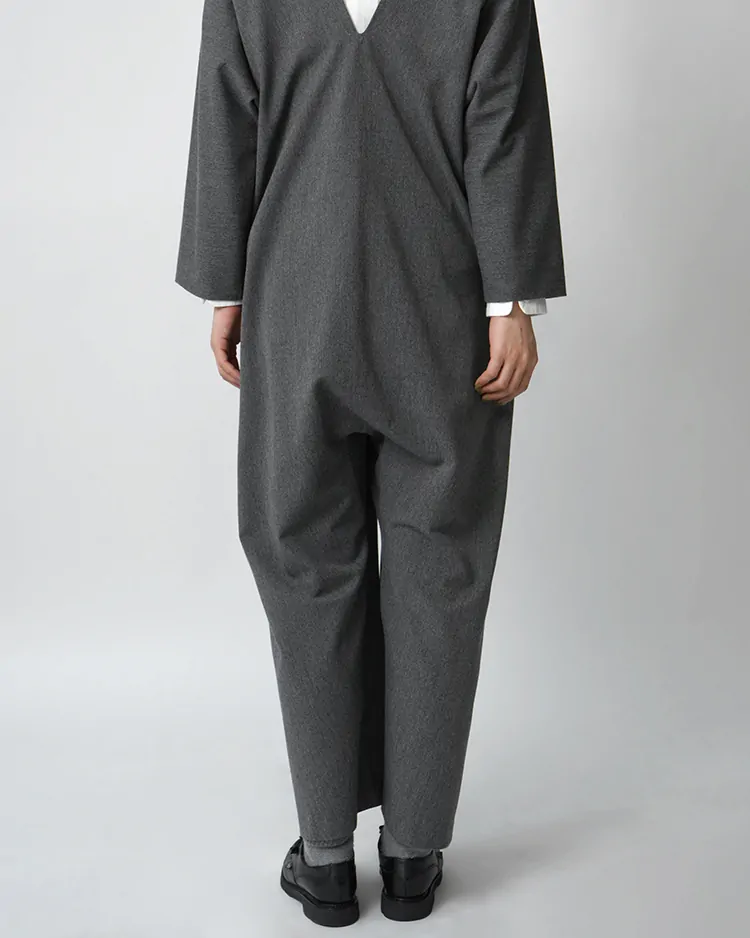 極めて平面的なパターンで仕立てたジャンプスーツです。人が立体的に着ることで、素材そのものの持つ特性が、自然なしわやよれとなって表れて、この生地ならではの表情を形作ります。