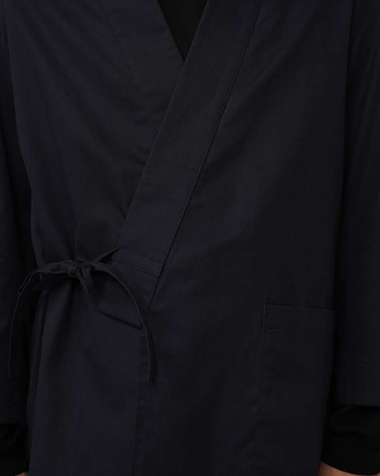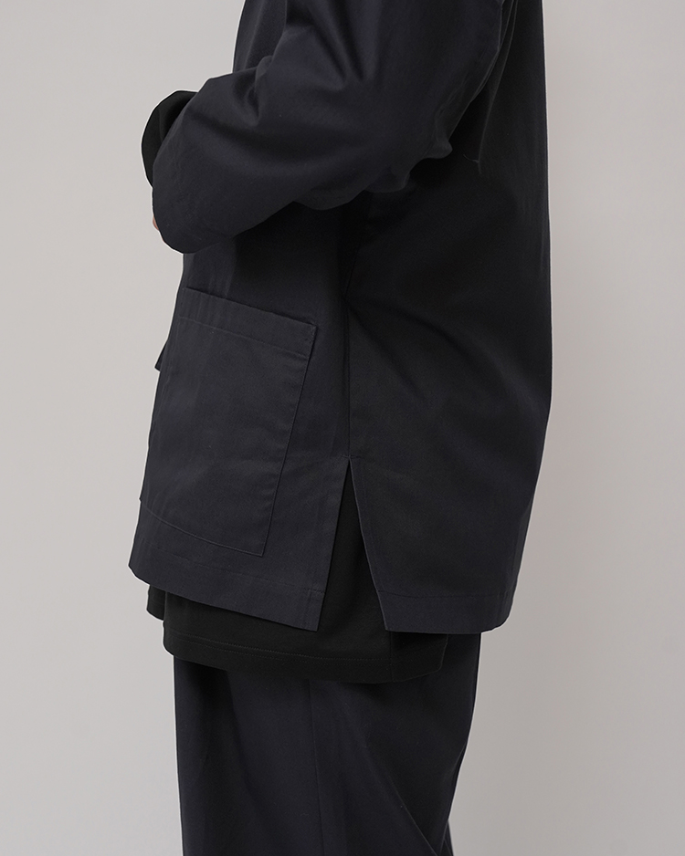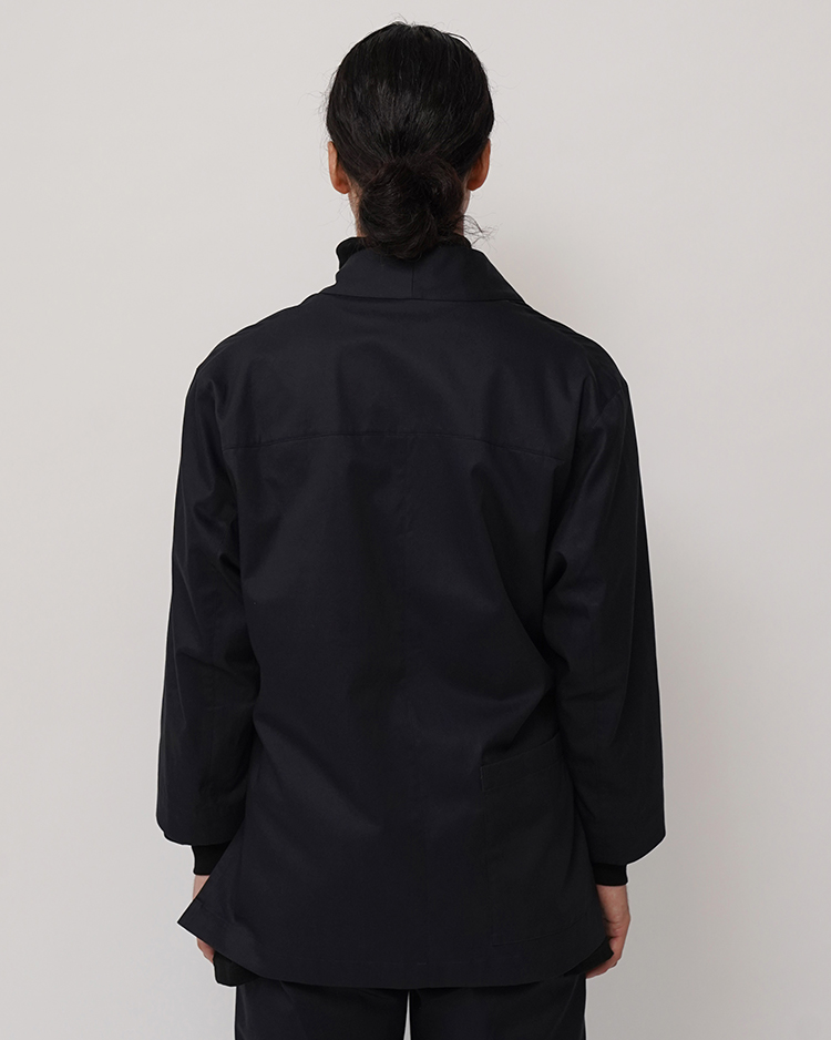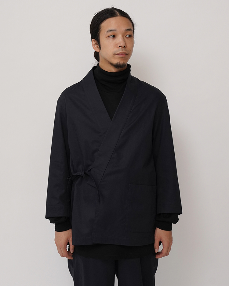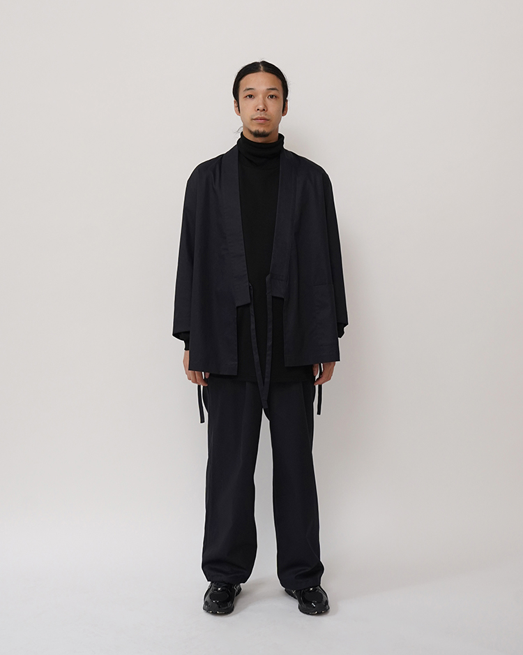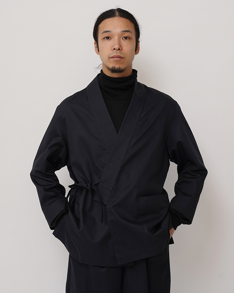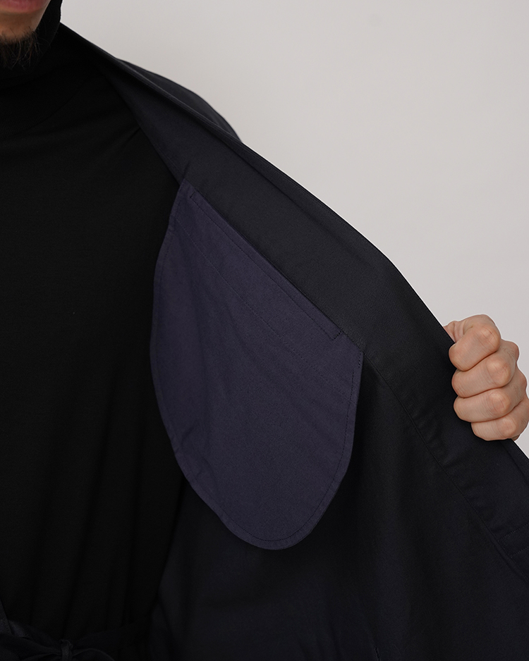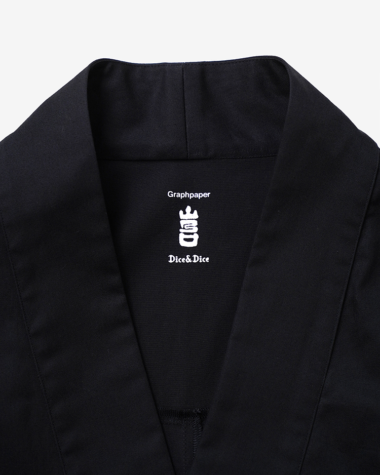 僕的に一番こだわったのは、この肩周りですね。テーラードジャケットのように前振りを付けて、肩から腕の可動域を広げています。普通の作務衣って、肩から腕までが直線で、ほとんど傾斜もないんですけど、そこをあえて立体的に設計したのがポイントです。パターンとしてもすごく面白い部分だと思います。生地は、水仕事や油汚れにも強くて、何度洗ってもへたらない頑丈な素材を採用しました。“仕事着”としてのリアルな強さですね。あとは、この首元のロゴ。山乃口さんのロゴをGraphpaperとDice&Diceで挟むように配置しています。全体のシルエットも、僕らが普段作る服に比べると少しコンパクトにしています。やっぱり作業着なので、動きやすさを損なわないサイズ感が大事で。でも、ただ小さくするんじゃなくて、ボリュームの出し方にはすごく気を遣いました。ファッションとしても着てもらえると思います。