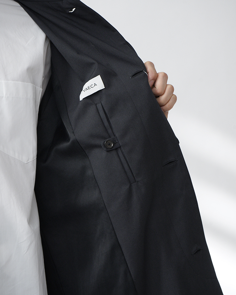 襟先やポケットの開け口の角を取ったり、縫製を極力省くことでミニマルな印象に仕上げています。