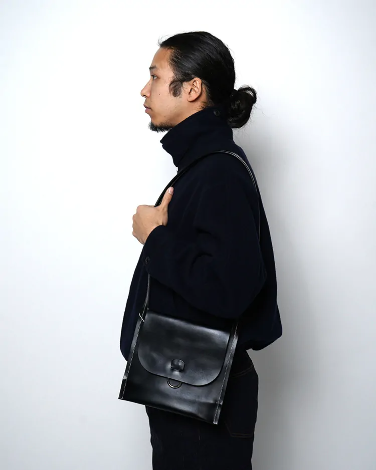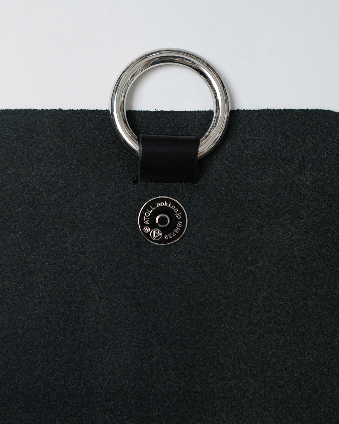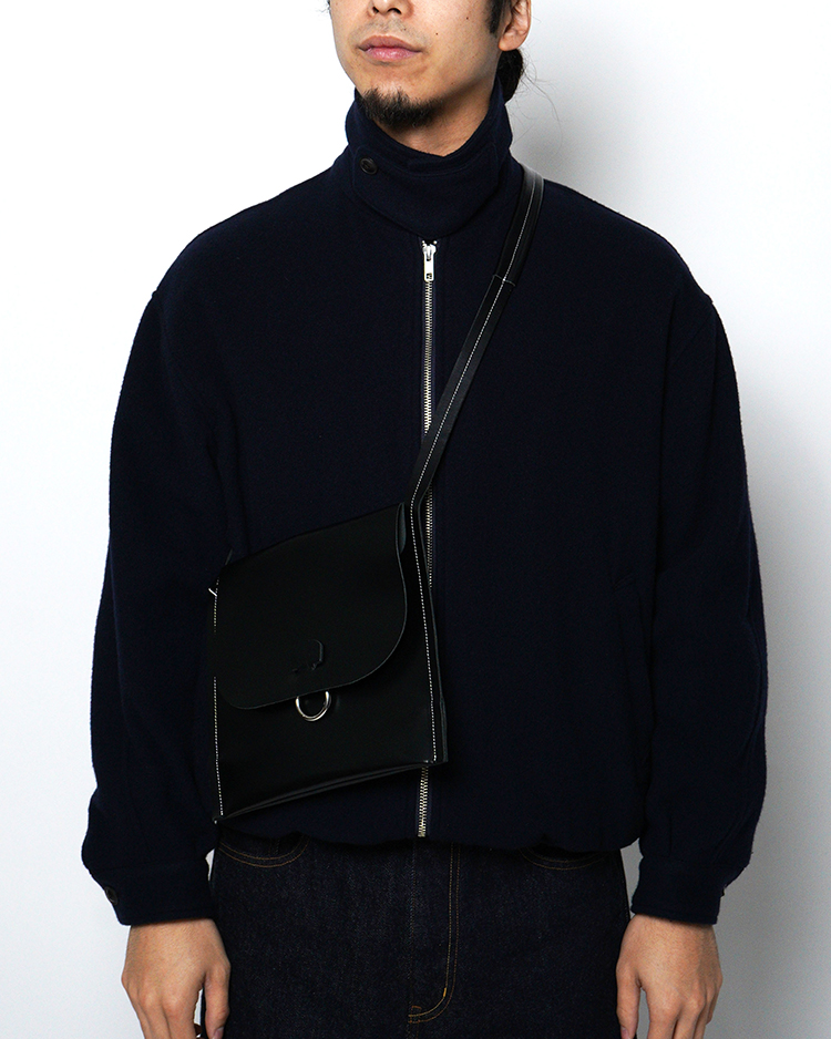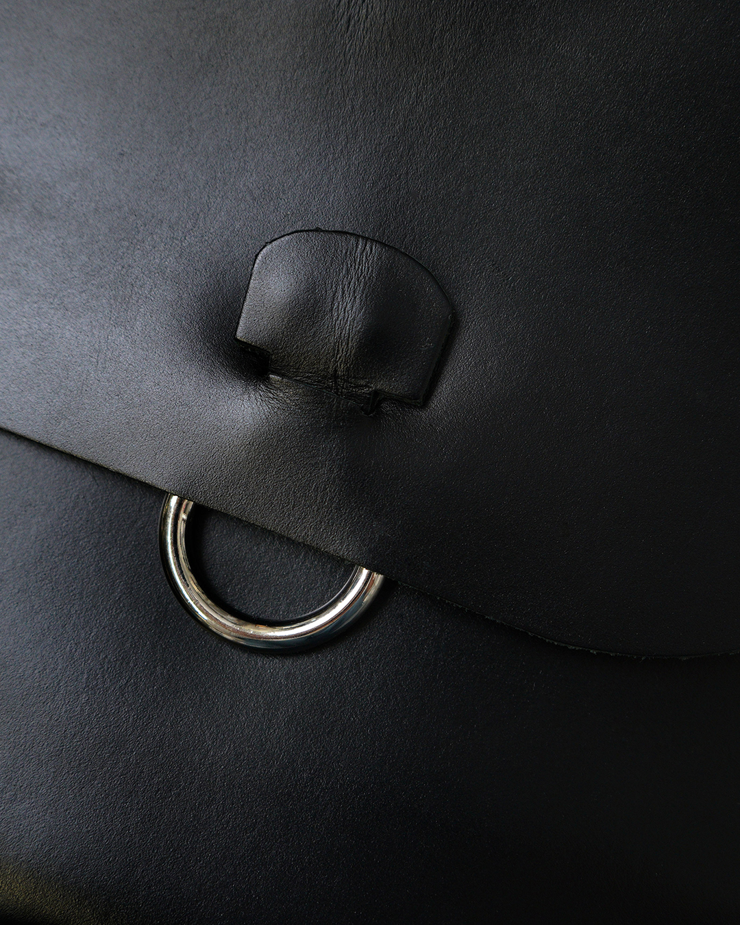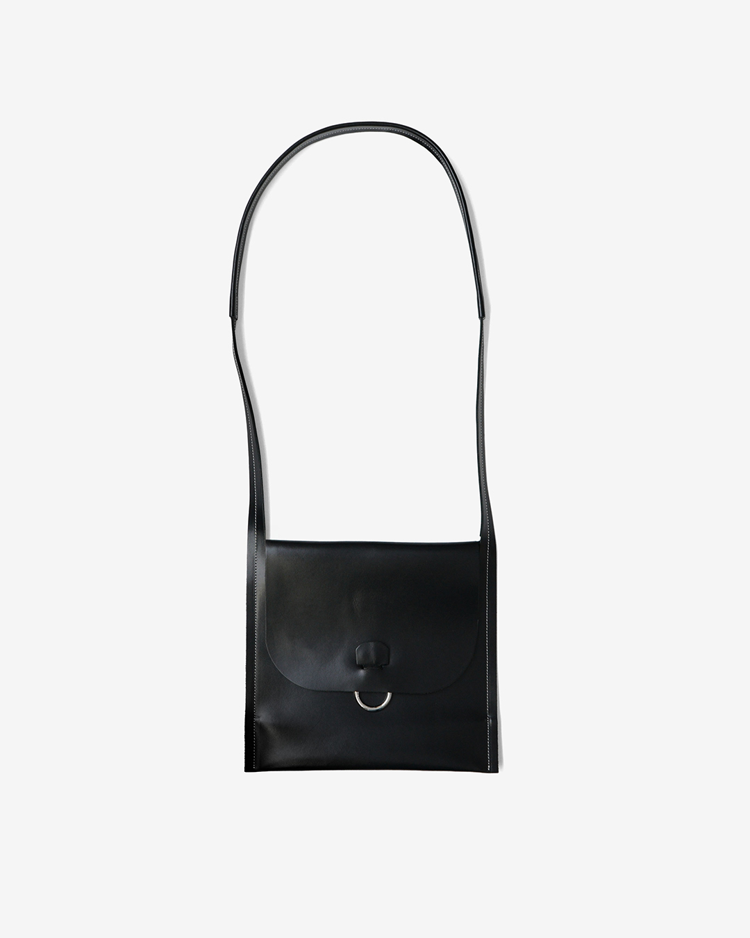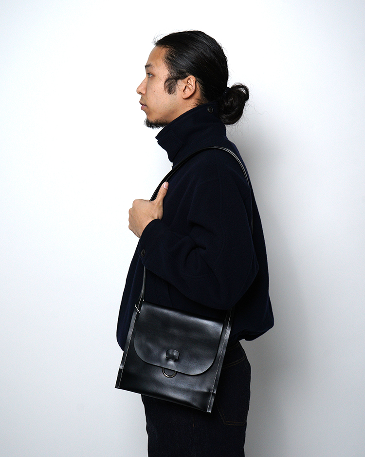 最小限の要素で構成されたシリーズで、一枚の革を折りたたんだ本体にホワイトステッチとリングがアクセントとして施されています。