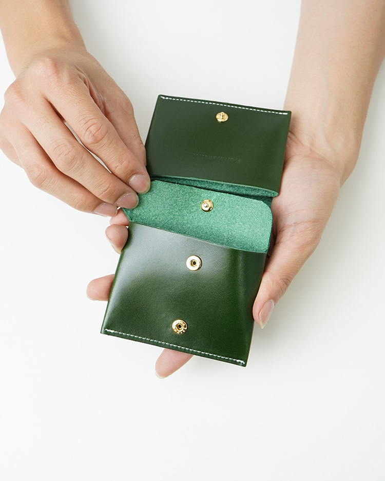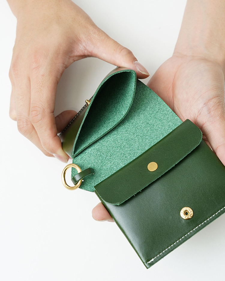 最小限の要素で構成されたシリーズで、一枚の革を折りたたんだ本体にホワイトステッチとリングがアクセントとして施されています。