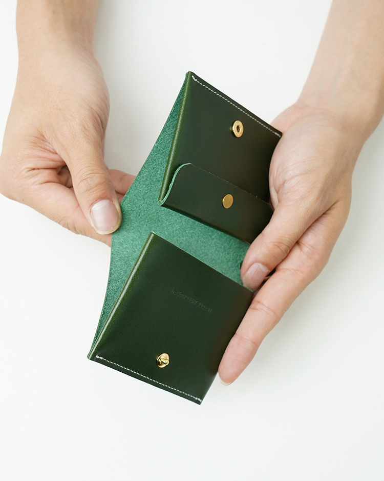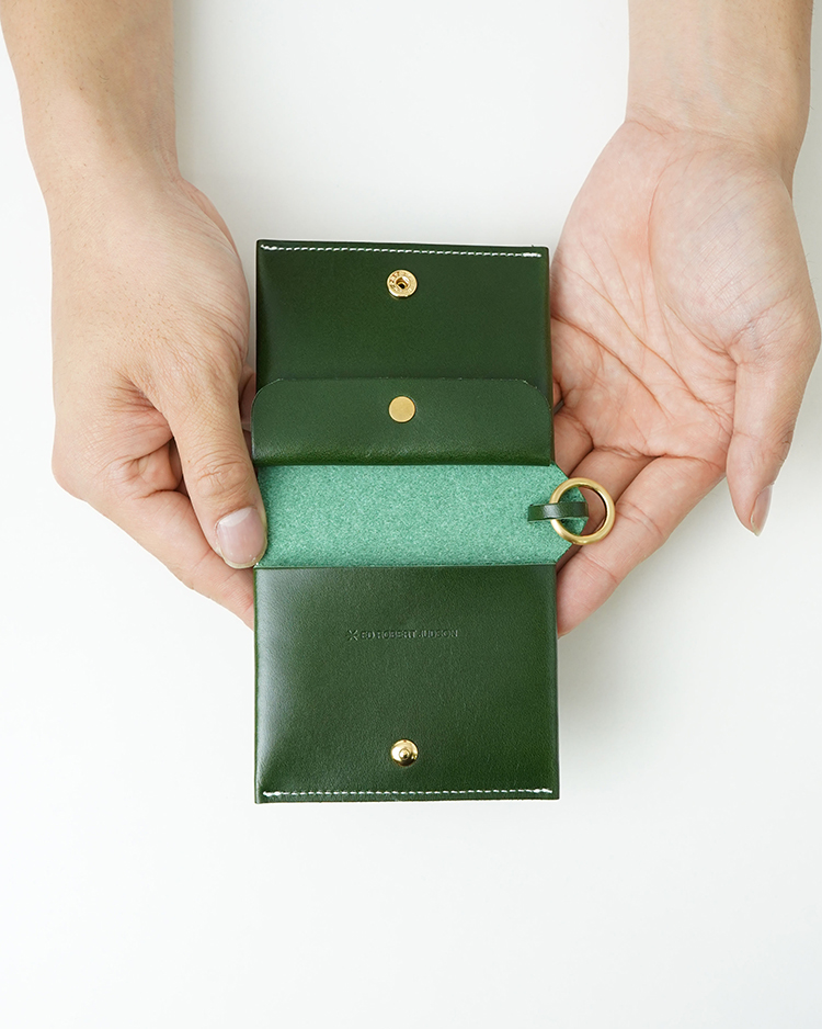 最小限の要素で構成されたシリーズで、一枚の革を折りたたんだ本体にホワイトステッチとリングがアクセントとして施されています。
