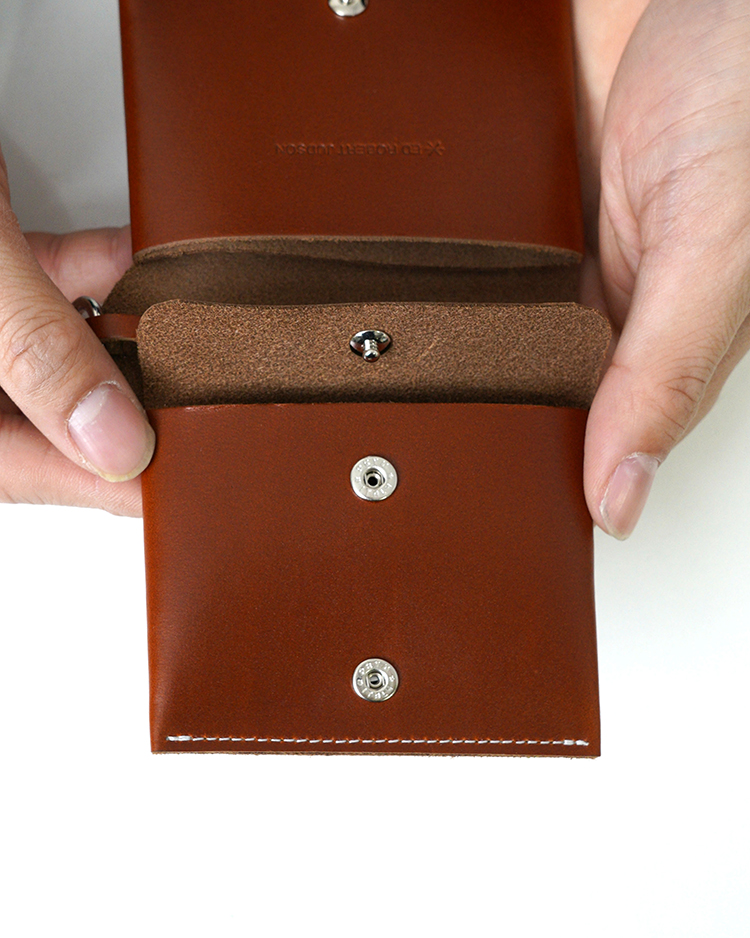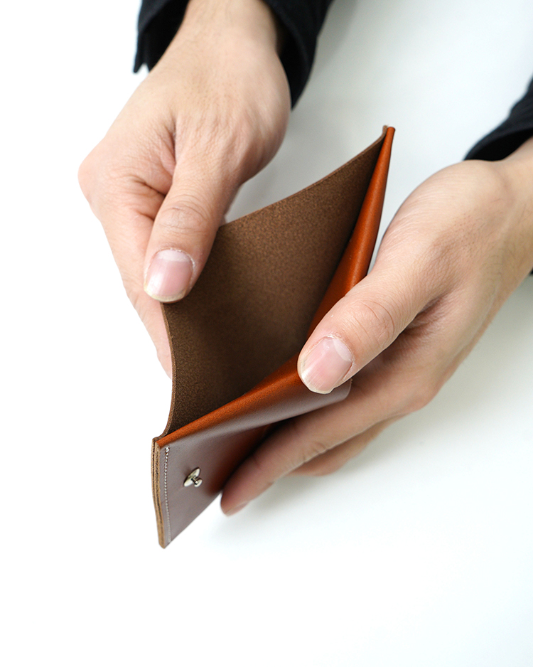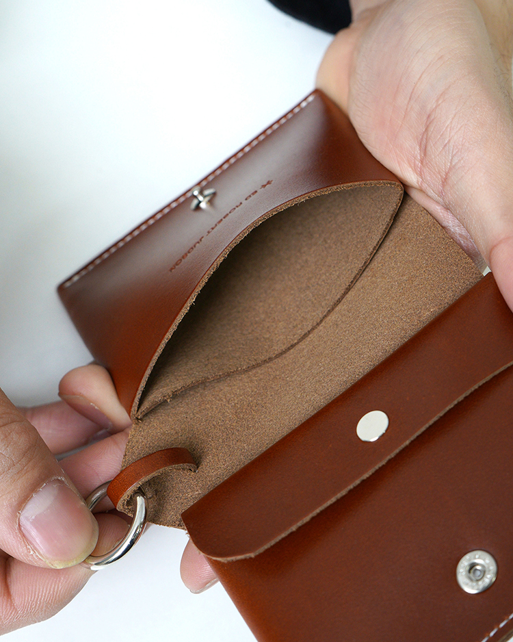 最小限の要素で構成されたシリーズで、一枚の革を折りたたんだ本体にホワイトステッチとリングがアクセントとして施されています。