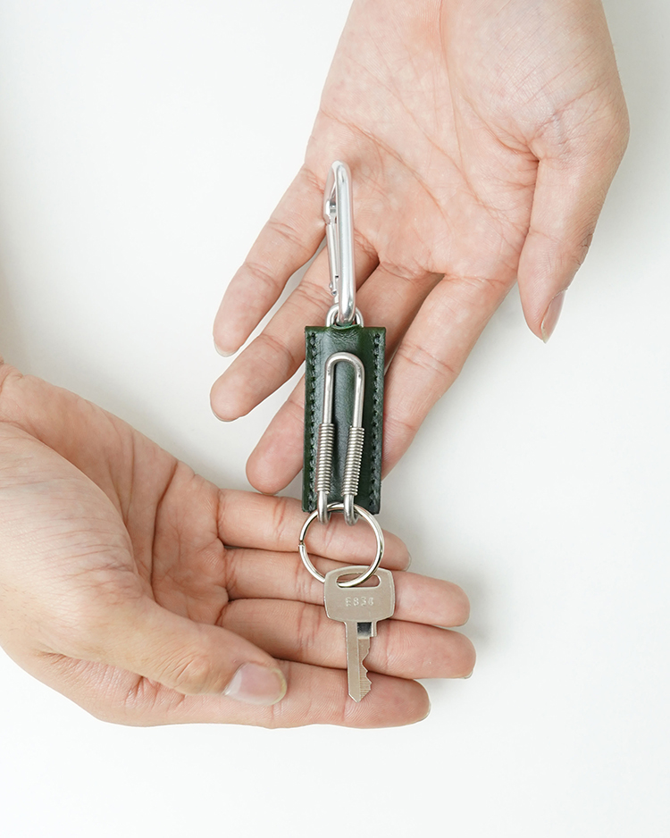スタイルに合わせて、クリップとカラビナのどちらでもパンツのループなどに引っ掛けられるキーホルダーです。クリップ部分には、コイル部分が可動するオリジナルの金具を採用しています。