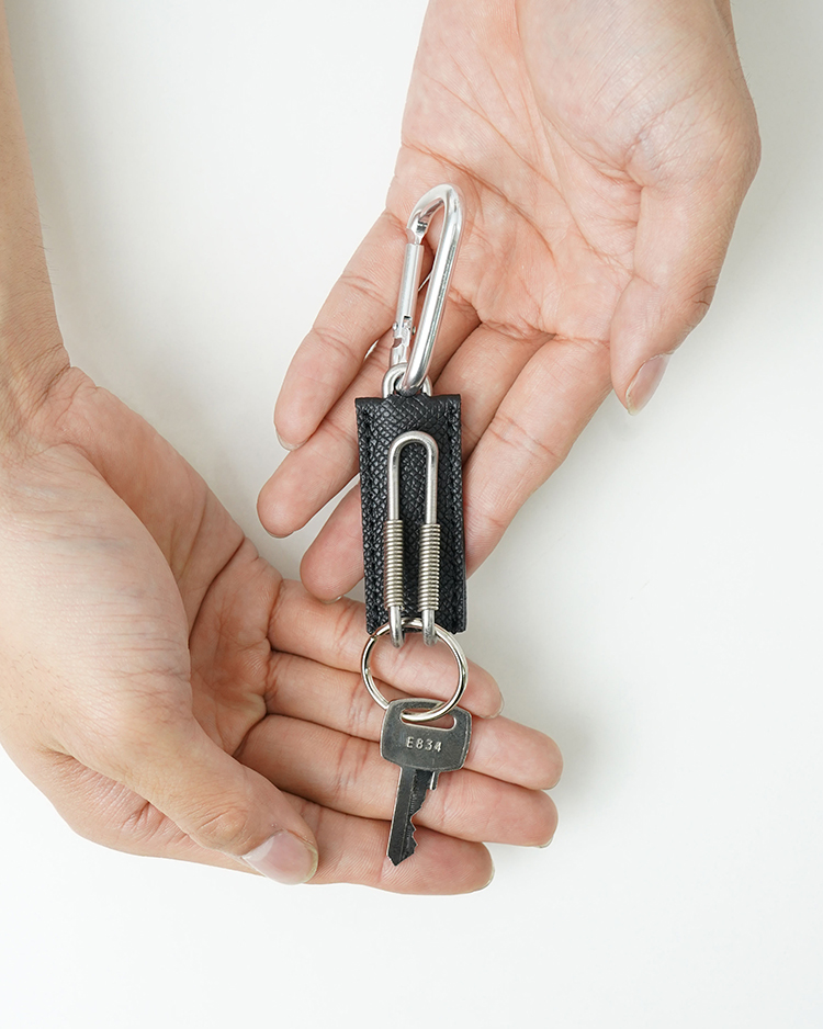 スタイルに合わせて、クリップとカラビナのどちらでもパンツのループなどに引っ掛けられるキーホルダーです。クリップ部分には、コイル部分が可動するオリジナルの金具を採用しています。