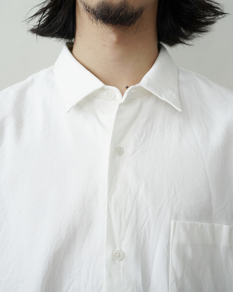 身幅も大きく、着丈も長め。大きなシルエットだけど、どこか品のある。ゆったりと大きめに羽織るのが気持ちいい、YAECA定番のボタンシャツです。