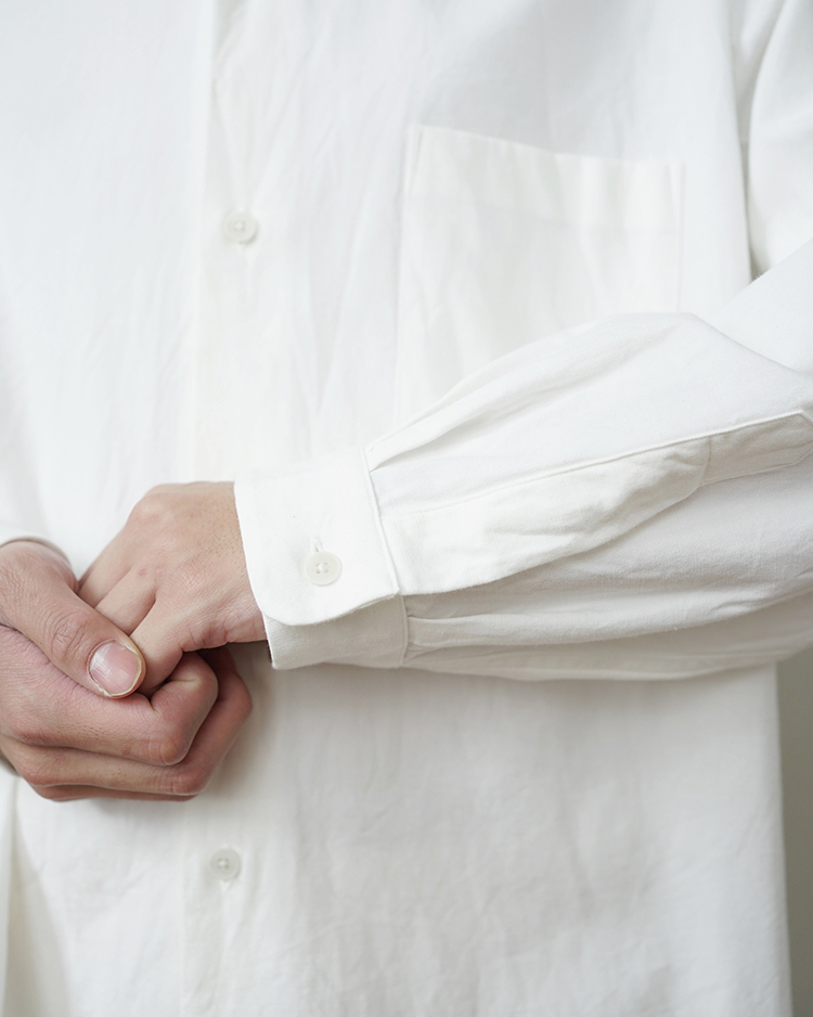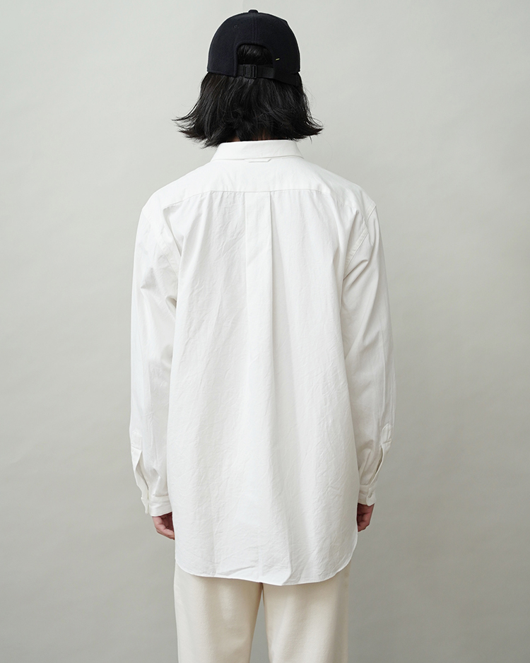 身幅も大きく、着丈も長め。大きなシルエットだけど、どこか品のある。ゆったりと大きめに羽織るのが気持ちいい、YAECA定番のボタンシャツです。