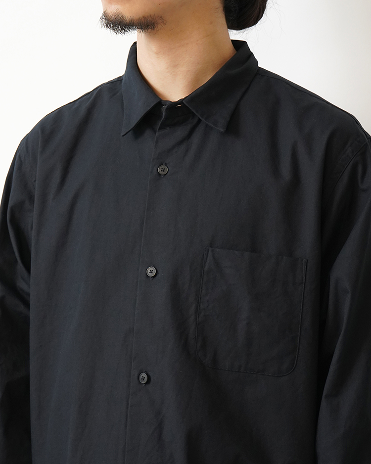 身幅も大きく、着丈も長め。大きなシルエットだけど、どこか品のある。ゆったりと大きめに羽織るのが気持ちいい、YAECA定番のボタンシャツです。
