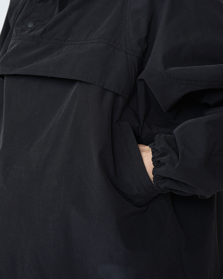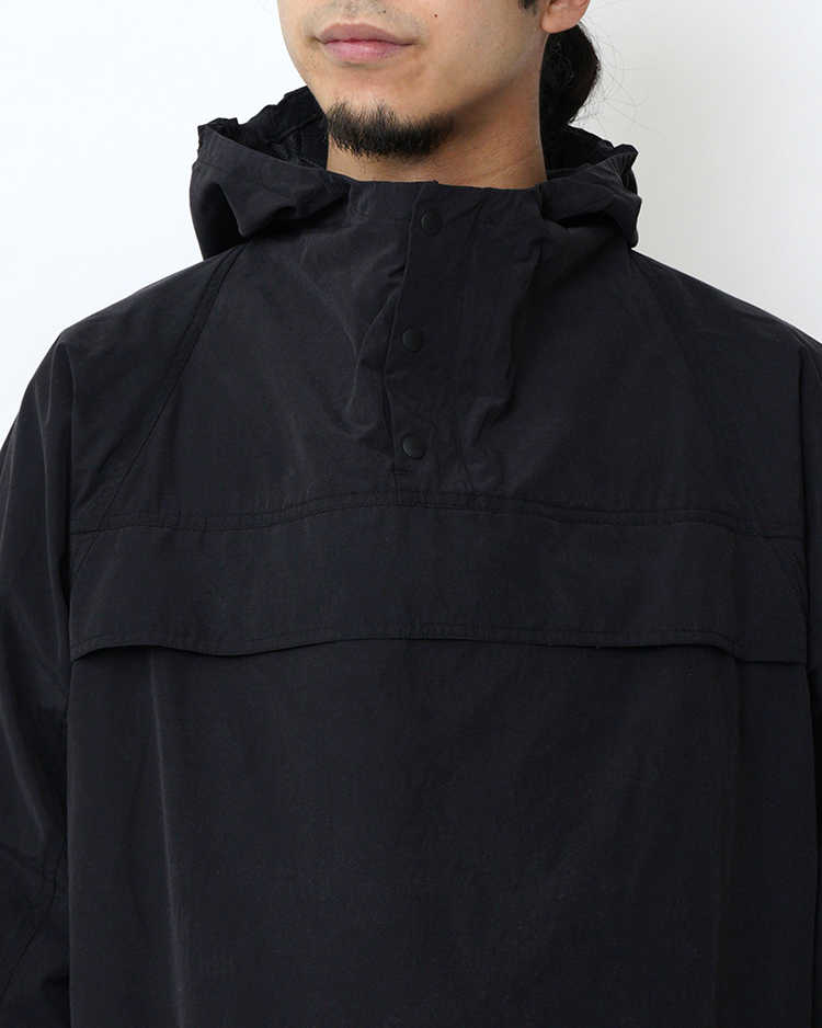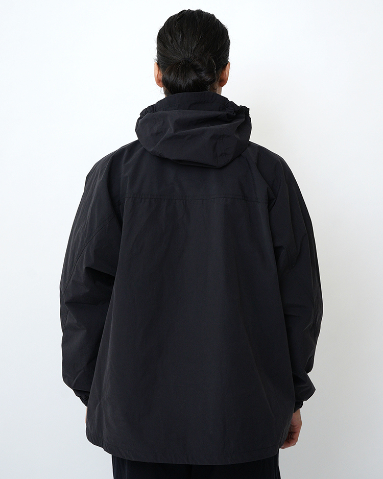 細番手のコットンとナイロンを密に織って、伸縮性のある生地を作りました。自然なシワ感があって、肌馴染みの良い生地です。大きなパーカーですが、自然に伸びて、体が動かしやすいのも特徴です。